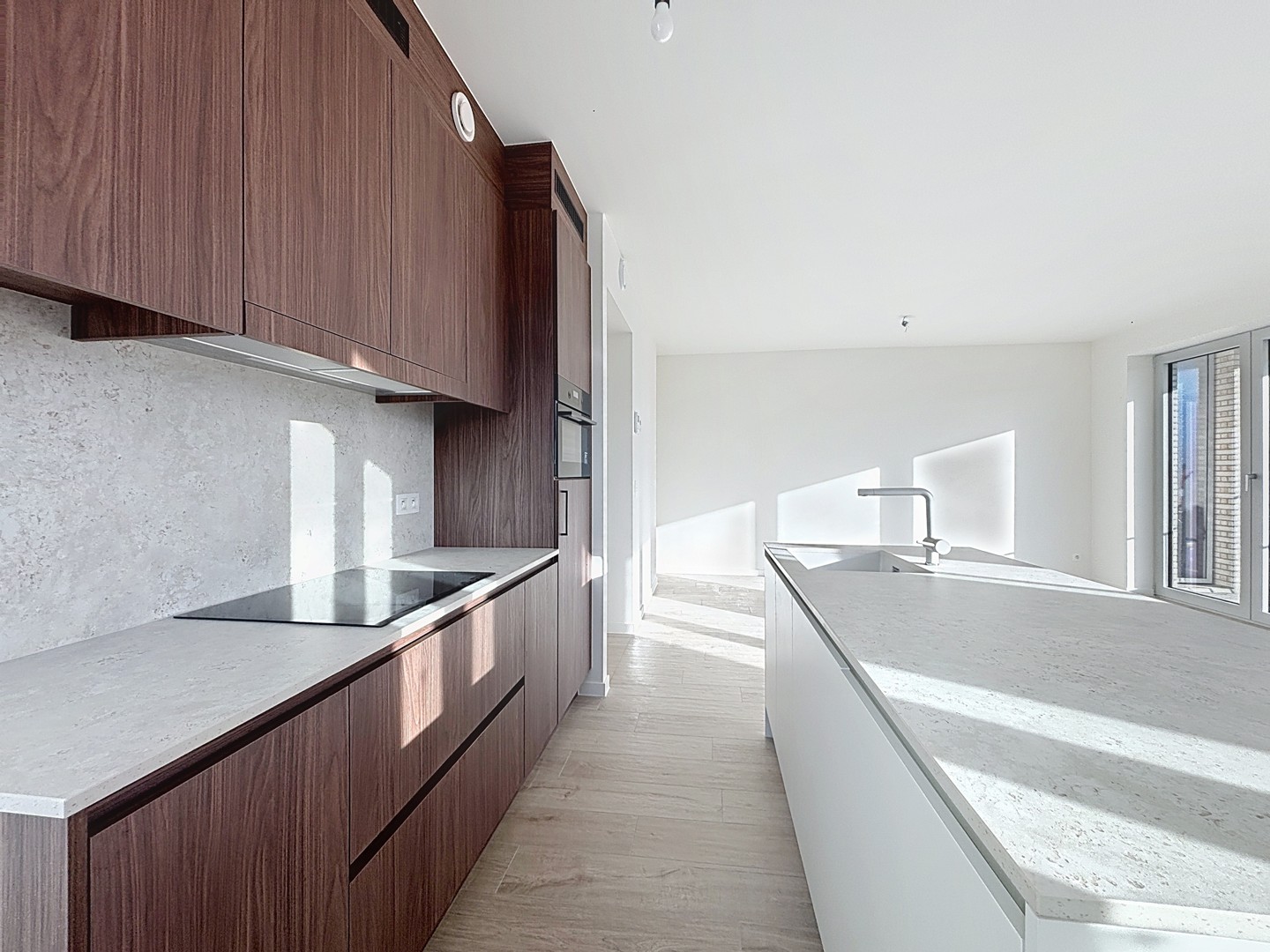 Inkomhal met aparte wc; berging; woonkamer met open keuken en eiland; terras; badkamer met inloopdouche; 2 slaapkamers met zicht op het nieuwe Vetten Os Plein.