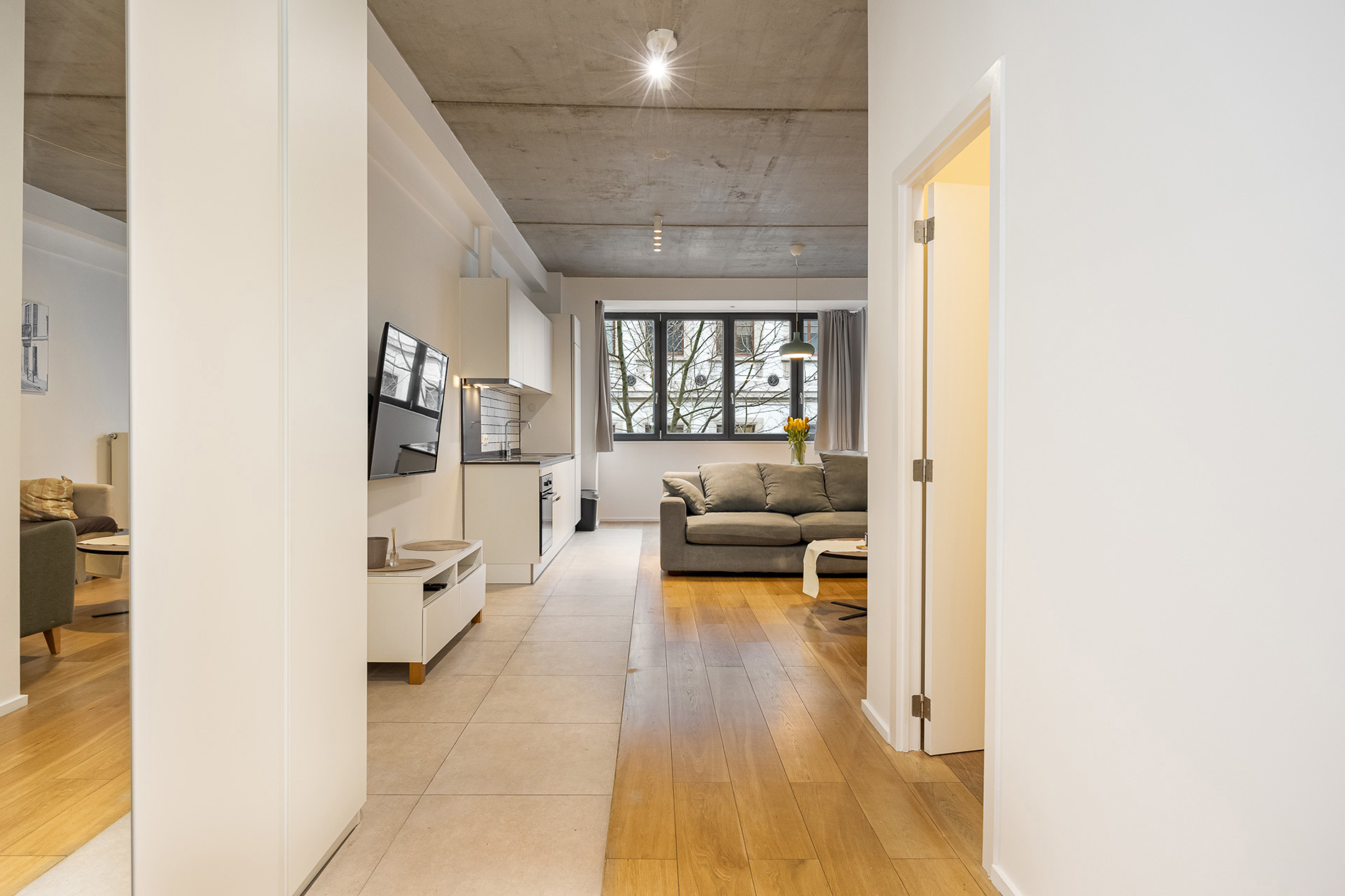 Ruime inkomhal met grote kasten. Rechts bevindt zich de badkamer, uitgerust met een lavabomeubel, een inloopdouche en een combinatie was- en droogmachine. Verder is er een volwaardige slaapkamer voorzien van een dubbel bed. Links van de inkomhal bevindt zich een apart toilet. De ruime leefruimte is volledig bemeubeld en beschikt over een geïnstalleerde open keuken met kookplaat en dampkap, combi-oven, koelkast en vrieskast, gootsteen en een vaatwasser.