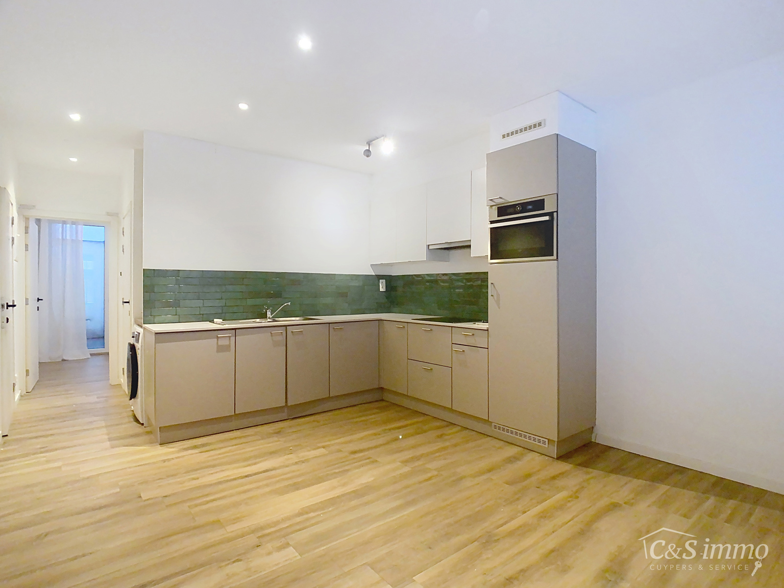 Bij binnenkomst betreed je de woonkamer (ca 19m²). De vloer is voorzien van keramische tegels met een parketlook. De woonkamer voorzien een open keuken, uitgerust met moderne toestellen, waaronder een koelkast met vriesvak, kookplaat, dampkap en een combi-oven.