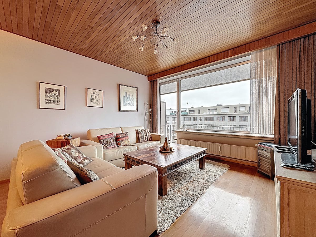 Appartement gelegen op de vijfde verdieping te bereiken met lift kent volgende indeling:-ruime leefruimte die toegang geeft tot het terras-keuken voorzien van ijskast met vriesvak, enkele spoelbak, kookvuur en zeer veel kastruimte-nachthal-badkamer met douche, lavabomeubel-bergruimte met aansluiting voor wasmachine en droogkast-2 volwaardige slaapkamers-toilet apart-terras achteraan het gebouwBijzonderheden:-volledig gemeubeld zonder extra meerkost-gemeenschappelijke fietsenberging- gemeenschappelijke parkeerplaatsen voor het gebouw-gemeenschappelijke kosten 110 euro/maand inclusief water en verwarming-EPC B-per direct beschikbaar-zonneweringen aanwezigLet op:-het is voor 2026 niet mogelijk om in dit appartement uw domicilie te plaatsen