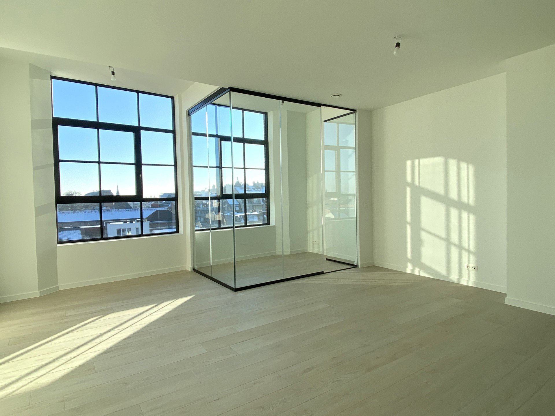De leefruimte is ruim en lichtrijk en sluit aan op een aparte slaaphoek die werd afgewerkt met een glazen, verschuifbare wand met deur, wat zorgt voor een open maar toch afgescheiden slaapgedeelte. Aansluitend bevindt zich een inpandig terras.