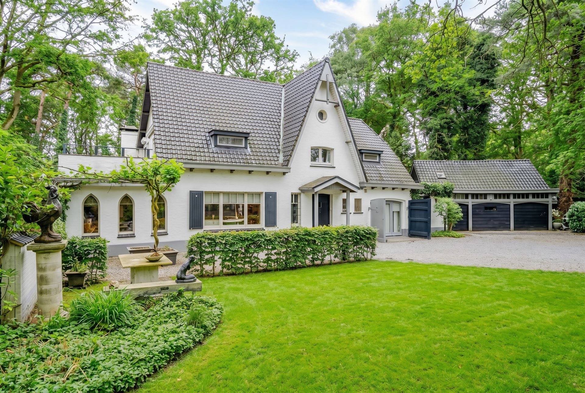 Exclusieve, charmante villa in een uitzonderlijk groen en rustgevend kader, met royale leefruimtes, 4 à 5 slaapkamers, 2 badkamers, garages en bijgebouwen, gelegen op een prachtig en zonnig perceel van 3.160 m².