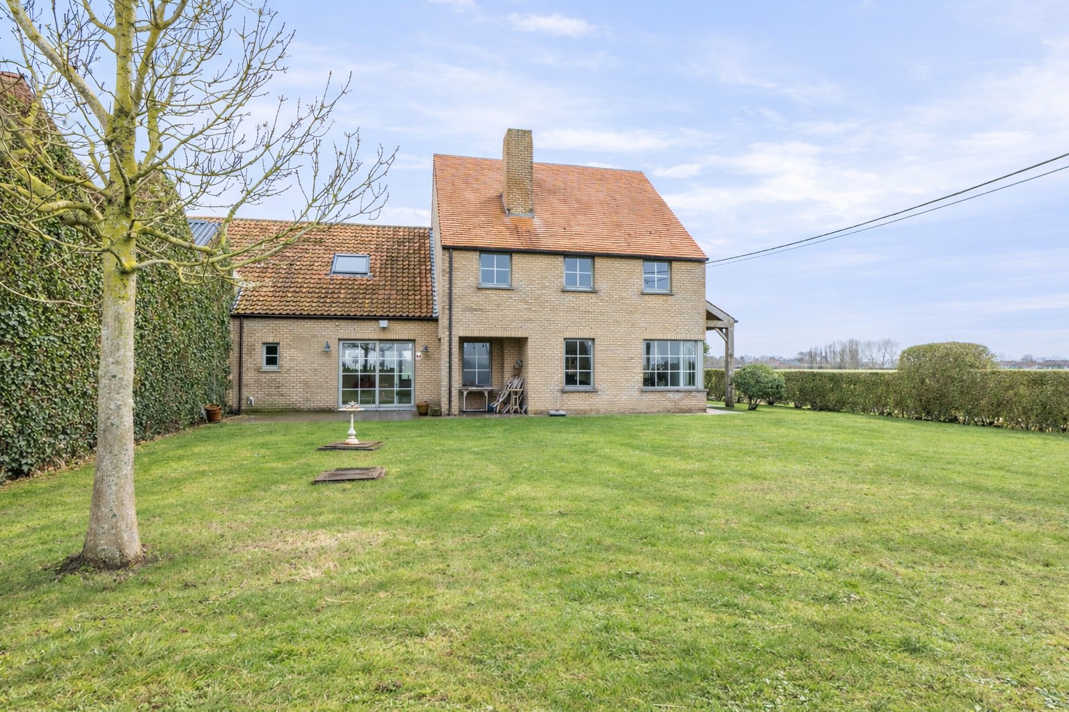 Op de verdieping zijn er drie slaapkamers en een volledig ingerichte badkamer. De woning beschikt over twee inpandige garages en een grote atelierruimte/schuur te gebruiken voor opslagruimte of hobbyruimte of garage. De buitenruimte en de zichten over de omliggende velden zijn ongelofelijk mooi. Genieten van de rust en dat vlakbij Knokke centrum.