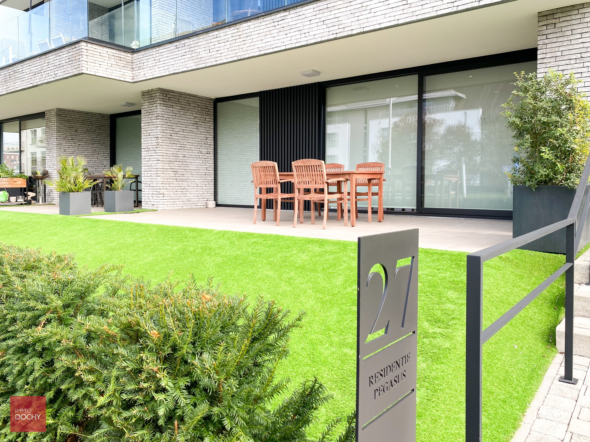 Vlotte verbinding naar E17 en wandelpad naar centrum. Gelijkvloers appartement van klassevolle residentie 'Pegasus', bestaande uit een inkomhall, living, ingerichte keuken, berging, 2 slaapkamers, badkamer ('ligbad en douche), terras vooraan 21m², terras achteraan 26m² en ondergrondse garagebox. Private parking met laadpalen (Provisie syndiek 60 euro per maand)