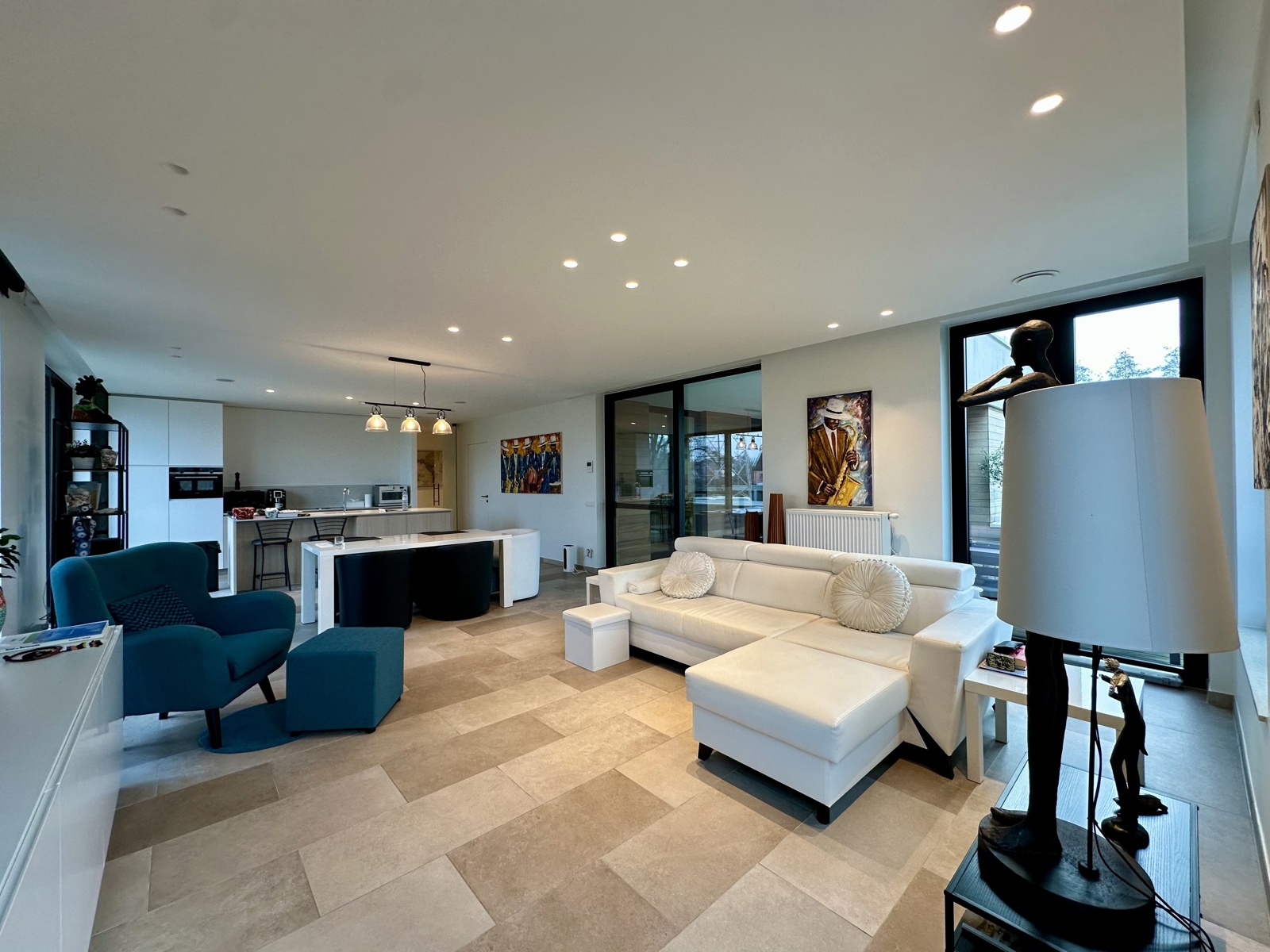 De indeling is als volgt: inkhomhal met vestiaire, gastentoilet, open geïnstalleerde keuken, zeer lichtrijke leefruimte, aparte berging/wasplaats, 2 ruime slaapkamers waarvan één met ensuite badkamer (lavabomeubel, inloopdouchedouche), master bedroom met ensuite badkamer (dubbel lavabomeubel, toilet en inloopdouche). 2 zonnige terrassen waarvan 1 deels overdekt (beiden met zicht op het groen!)