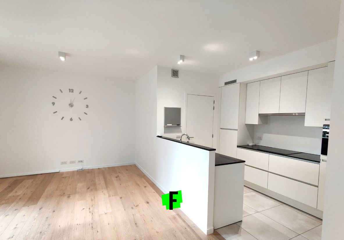 De leefruimte is zeer lichtrijk en ruim. Alle ramen geven allen uit op een groot terras (15m2) dat zicht heeft op een rustige verkeersvrije laan met toegang tot het groene stadspark. Er is mogelijkheid om buiten de maaltijden te nuttigen en er is plaats voor een knusse lounge hoek. De moderne open keuken is voorzien van alle nieuwste apparaten van het merk Siemens : vaatwasmachine, heteluchtoven combi microgolf, koelkast met vriesvak, inductie kookplaat met schouwdampkap. Aansluitend bij de keuken is er een afzonderlijke berging met legbanken en aansluiting voor wasmachine en droogkast.