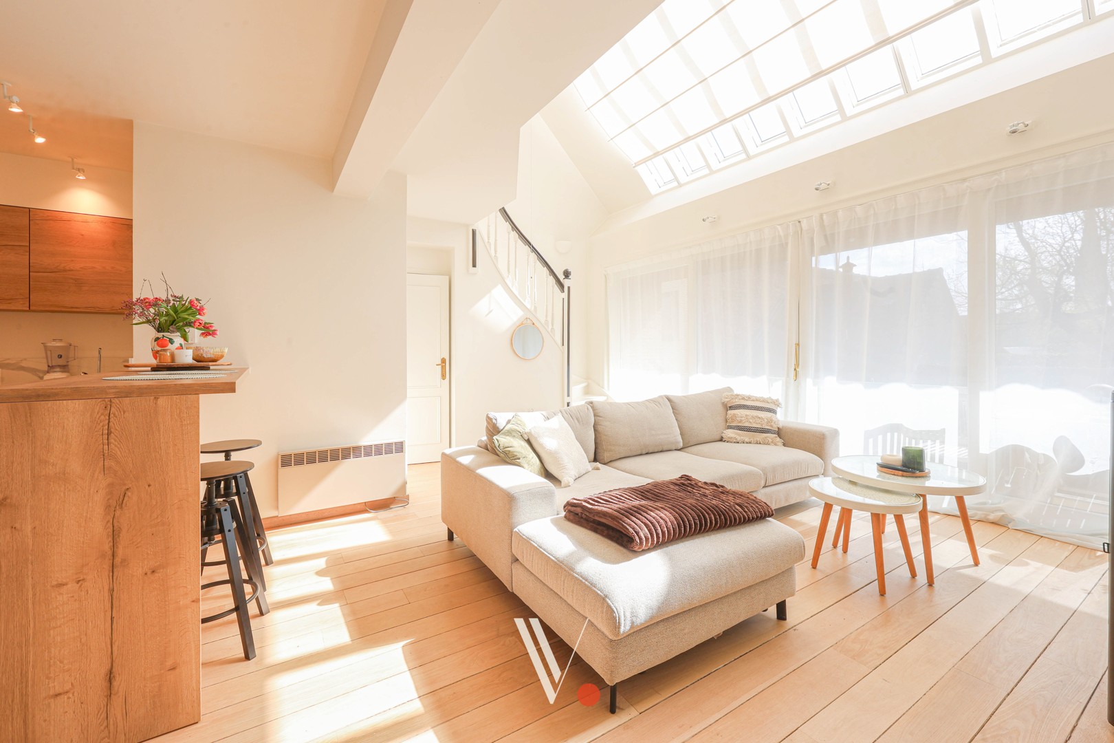 De lichtrijke leefruimte met open keuken en mezzanine vormt zonder twijfel de absolute blikvanger van deze woning en zorgt voor een ruimtelijk en eigentijds gevoel.