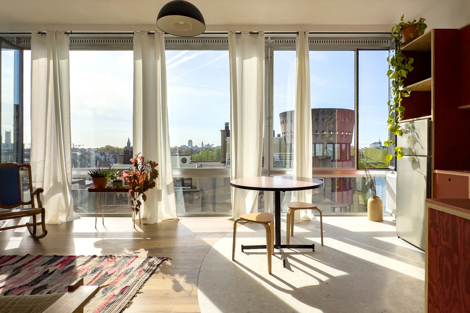 De studio beschikt over een plafondhoogte van 3m, dit in combinatie met de grote raampartijen zorgt voor een zeer aangenaam leefgevoel.