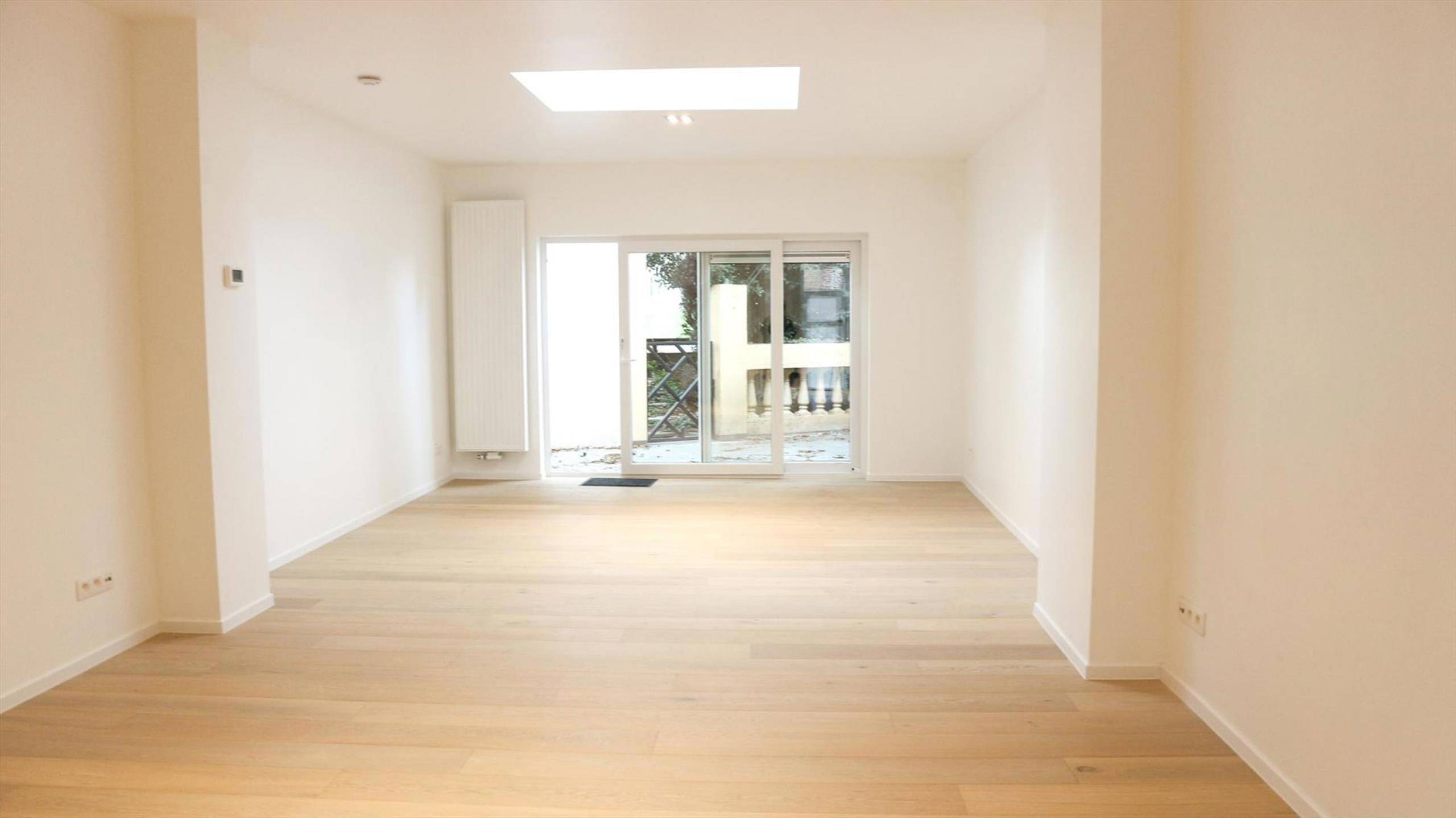 Vooraan de woning vinden we een mooie open keuken die uitgerust werd met SIEMENS-toestellen (hetelucht oven, inductiekookplaat en vaatwas). Daarnaast vinden we een zeer lichtrijke leefruimte die uitkomt op een gezellig terras in blauwhardsteen. Fietsenpoortje aanwezig.