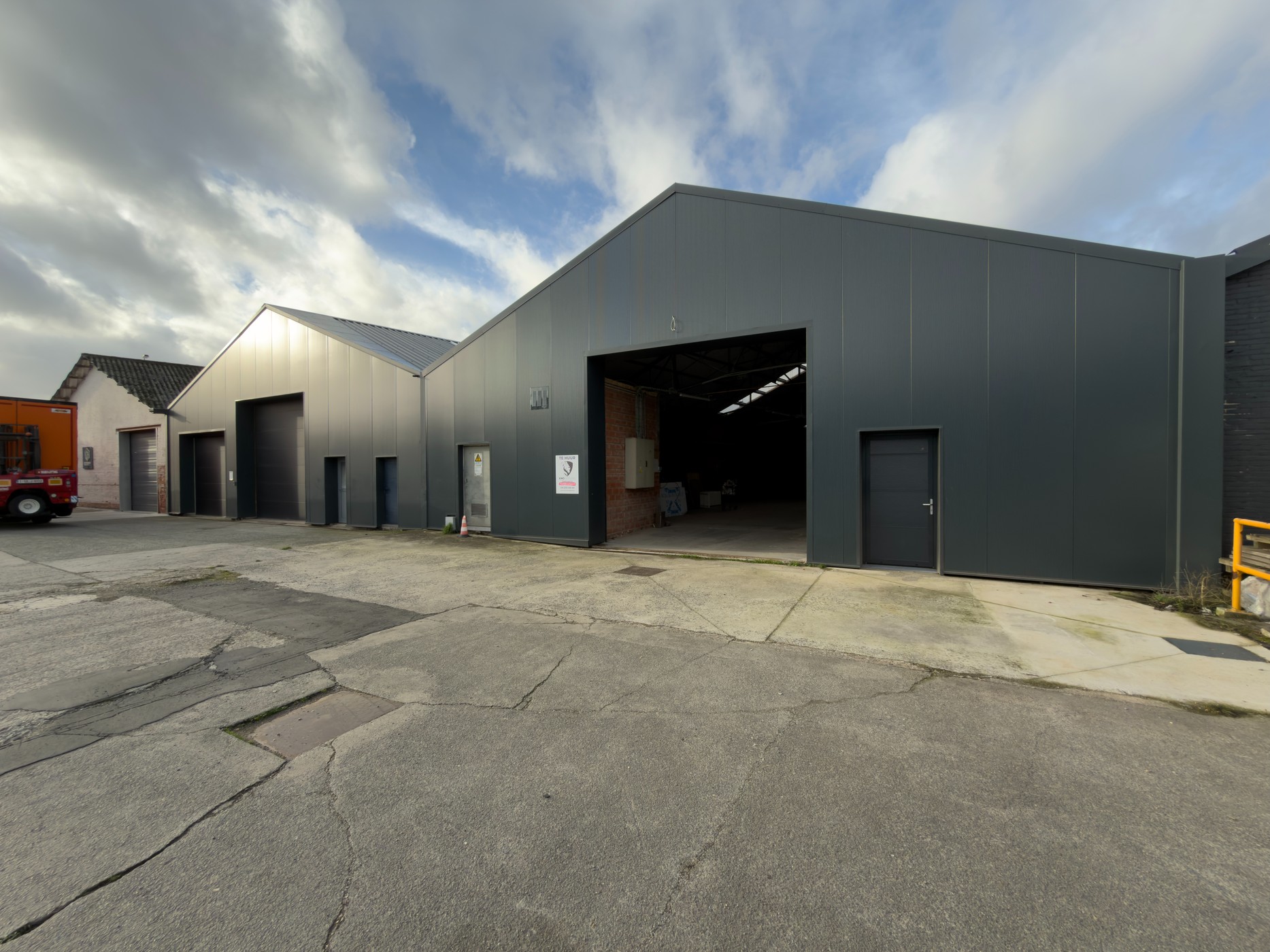 De loods werd recent grondig vernieuwd en beschikt over een nieuwe sectionale poort met een breedte van 4,5 meter en een hoogte van 4,2 meter, wat een vlotte toegang garandeert voor vracht- en bestelwagens.