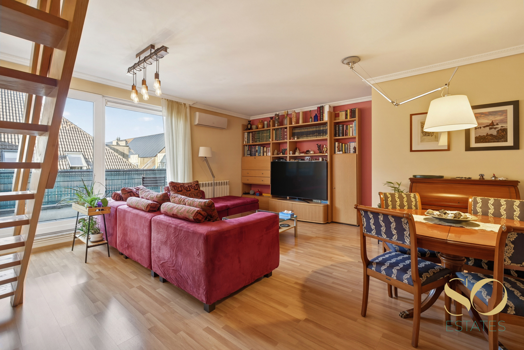 Gelegen in een gegeerde residentiële wijk van Etterbeek, in de onmiddellijke nabijheid van openbaar vervoer, scholen, winkels en groene ruimtes, bevindt deze ruime duplex met 4 slaapkamers en terras zich op de 4de en bovenste verdieping van een goed onderhouden gebouw. Het appartement is verdeeld over twee niveaus en biedt een ideale indeling voor een gezin, met aangename volumes en veel natuurlijke lichtinval. De eerste verdieping opent naar een mooie inkomhal met bergruimte en een apart toilet, die leidt naar een lichtrijke leefruimte met woonkamer en eetkamer, met toegang tot een aangenaam terras van 15 m², georiënteerd op het zuidwesten en met open zicht.De aparte volledig uitgeruste keuken is functioneel en praktisch ingericht. Op dit niveau bevindt zich ook een eerste slaapkamer met aansluitende badkamer.Op de bovenverdieping beschikt de duplex over drie extra slaapkamers, evenals een tweede badkamer, een derde toilet en een wasruimte, wat zorgt voor een comfortabele indeling voor een gezin.