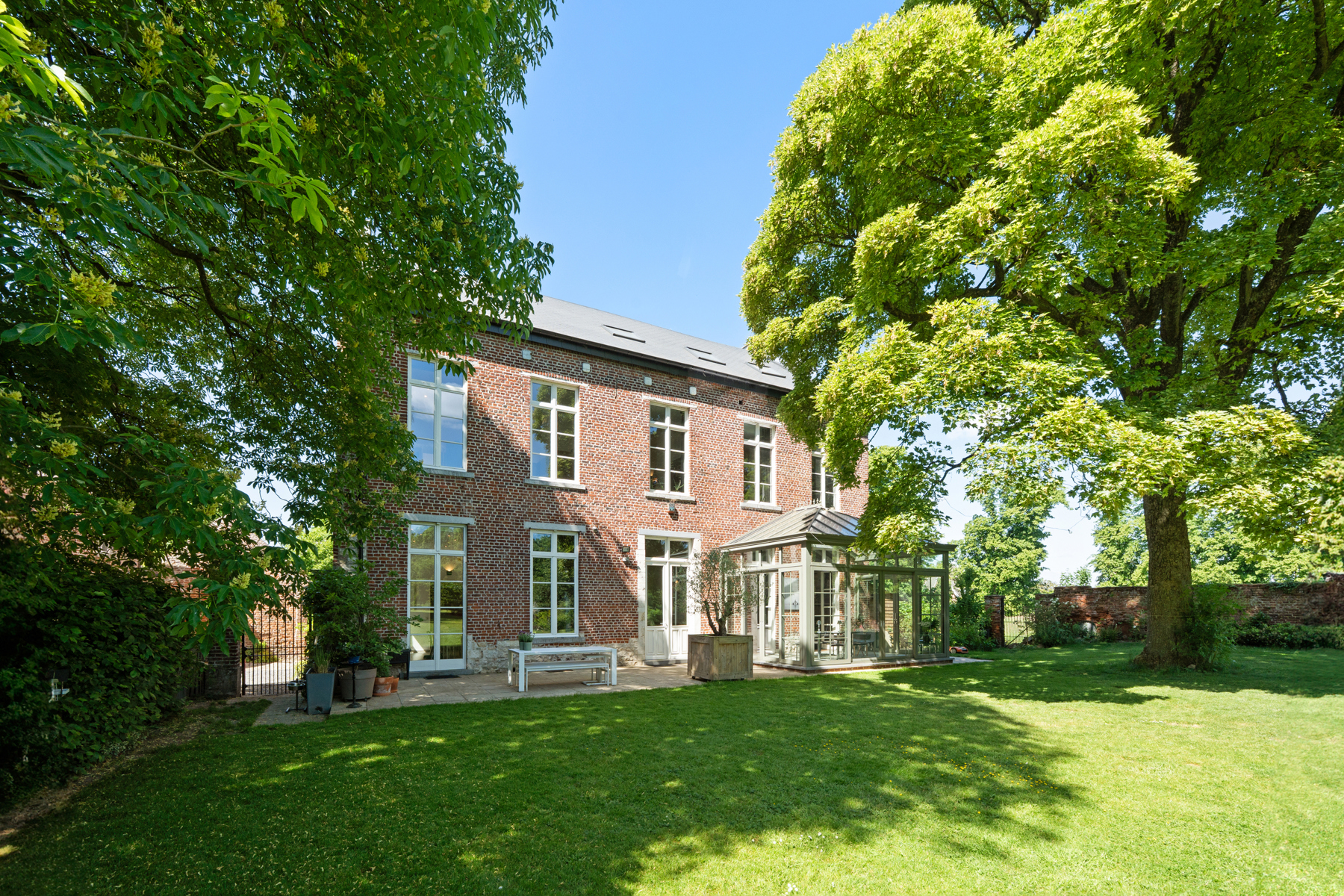 Bij het betreden van het hoofdgebouw wordt u verwelkomd door een majestueuze inkomhal die de toon zet voor het karaktervolle interieur. De woonruimtes – waaronder een ruime salon met open haard, een stijlvolle eetkamer, een gezellige keuken en een lichtrijke veranda – zijn hoogwaardig afgewerkt en stralen tijdloze klasse uit. Op de verdieping bevinden zich zes charmante slaapkamers en twee badkamers. De zolderverdieping biedt nog volop potentieel: een royale, volledig in te richten ruimte voor extra slaapkamers, een atelier of een ontspanningsruimte. De woning is bovendien onderkelderd en beschikt over onder meer een sfeervolle wijnkelder.