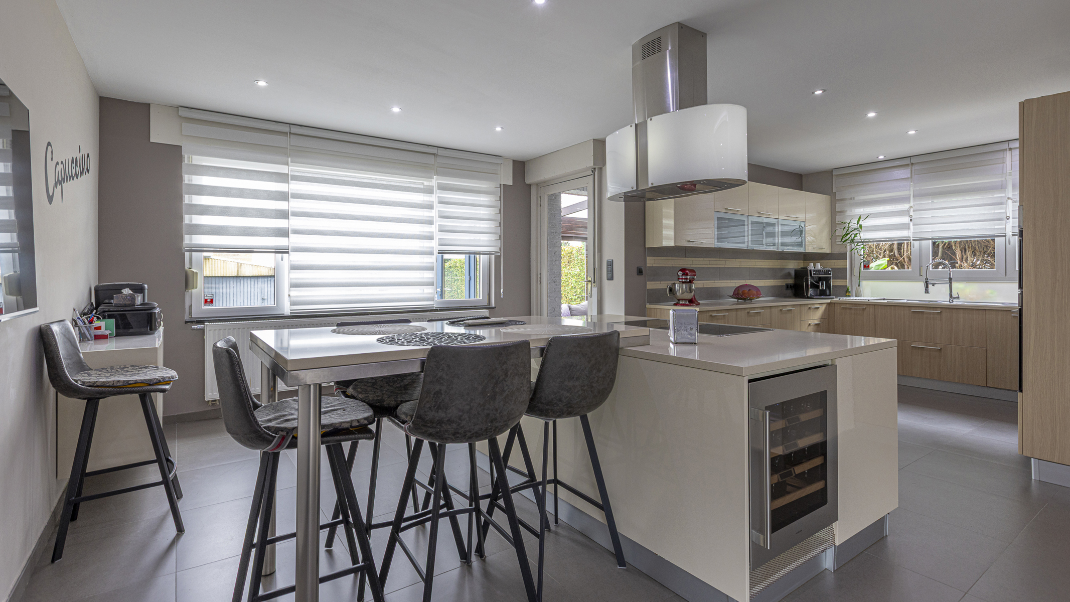 De inkomhal voorziet toegang tot de gezellige leefruimte met pelletkachel en volledig betegelde vloer. De open, moderne keuken is uitgerust met alle comfort en beschikt over een praktisch kookeiland. Op het gelijkvloers vind je bovendien een badkamer met inloopdouche en toilet, alsook een lichtrijke veranda met uitzicht op de tuin.