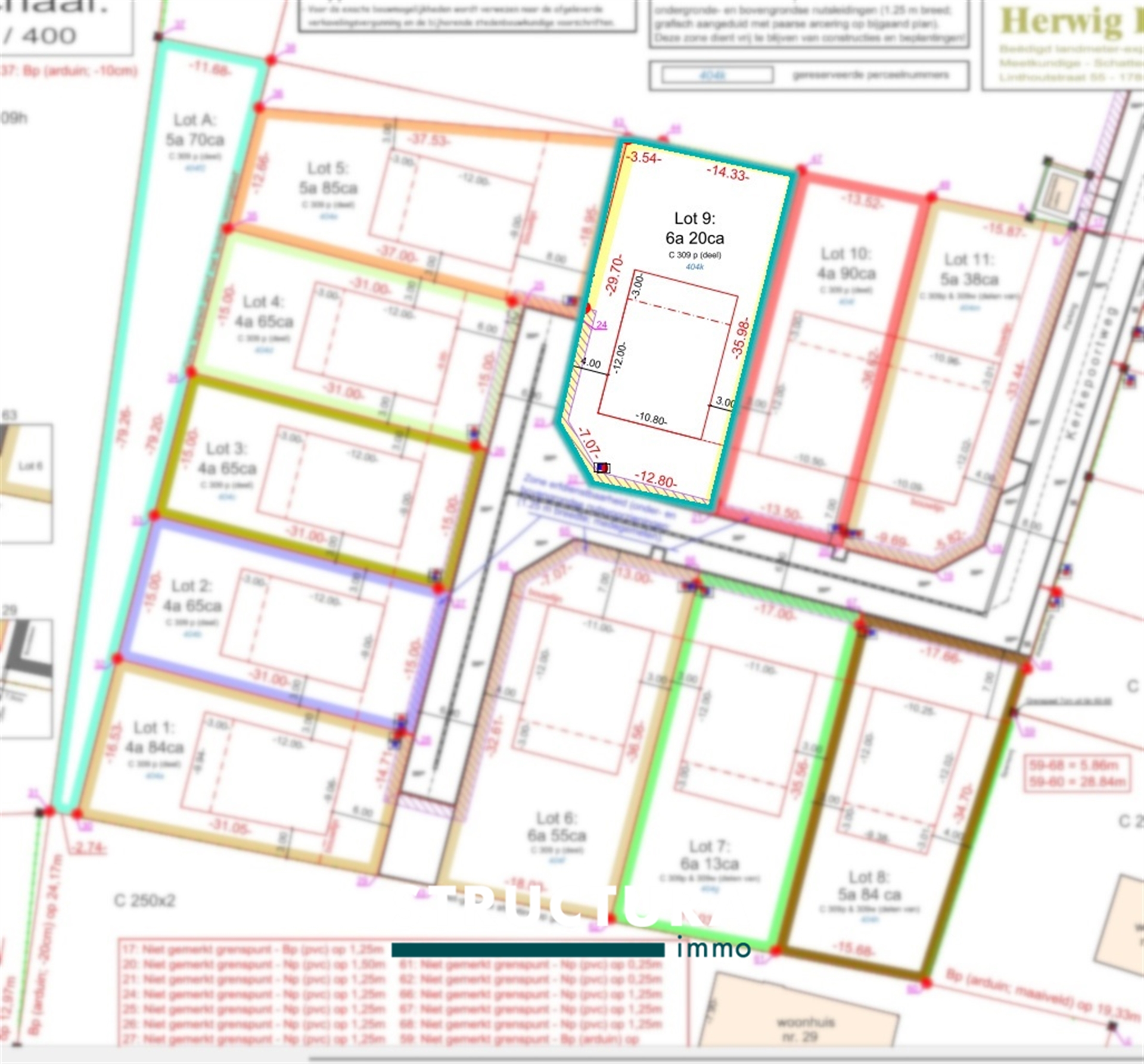 In een nieuwe verkaveling te Imde (Wolvertem) bevindt zich dit mooi perceel van 6a20ca, ideaal voor het realiseren van uw vrijstaande droomwoning.De bouwgrond (LOT 9) is gelegen in een doodlopende straat, omgeven door groen en geniet van een uitzonderlijk rustige ligging – perfect voor wie op zoek is naar privacy en een aangename woonomgeving.Belangrijkste bouwvoorschriften:- Open bebouwing- Bouwdiepte: max. 15 m (gelijkvloers) en 12 m (verdieping)- Bouwbreedte: max. 10,80 m- Kroonlijsthoogte: max. 6,30 m- Vrije dakvorm (plat of hellend dak mogelijk)- Minstens 1 garage en/of carport te voorzienPraktisch:- Aktekosten (€400 incl. btw) en opmetingskosten landmeter (€1.625 incl. btw) ten laste van de koperEen uitstekende opportuniteit voor wie wil bouwen op een rustige topligging in het landelijke Imde, met vlotte verbinding naar omliggende gemeenten.Meer informatie? Contacteer ons via 02 460 80 46 of info@structura.be