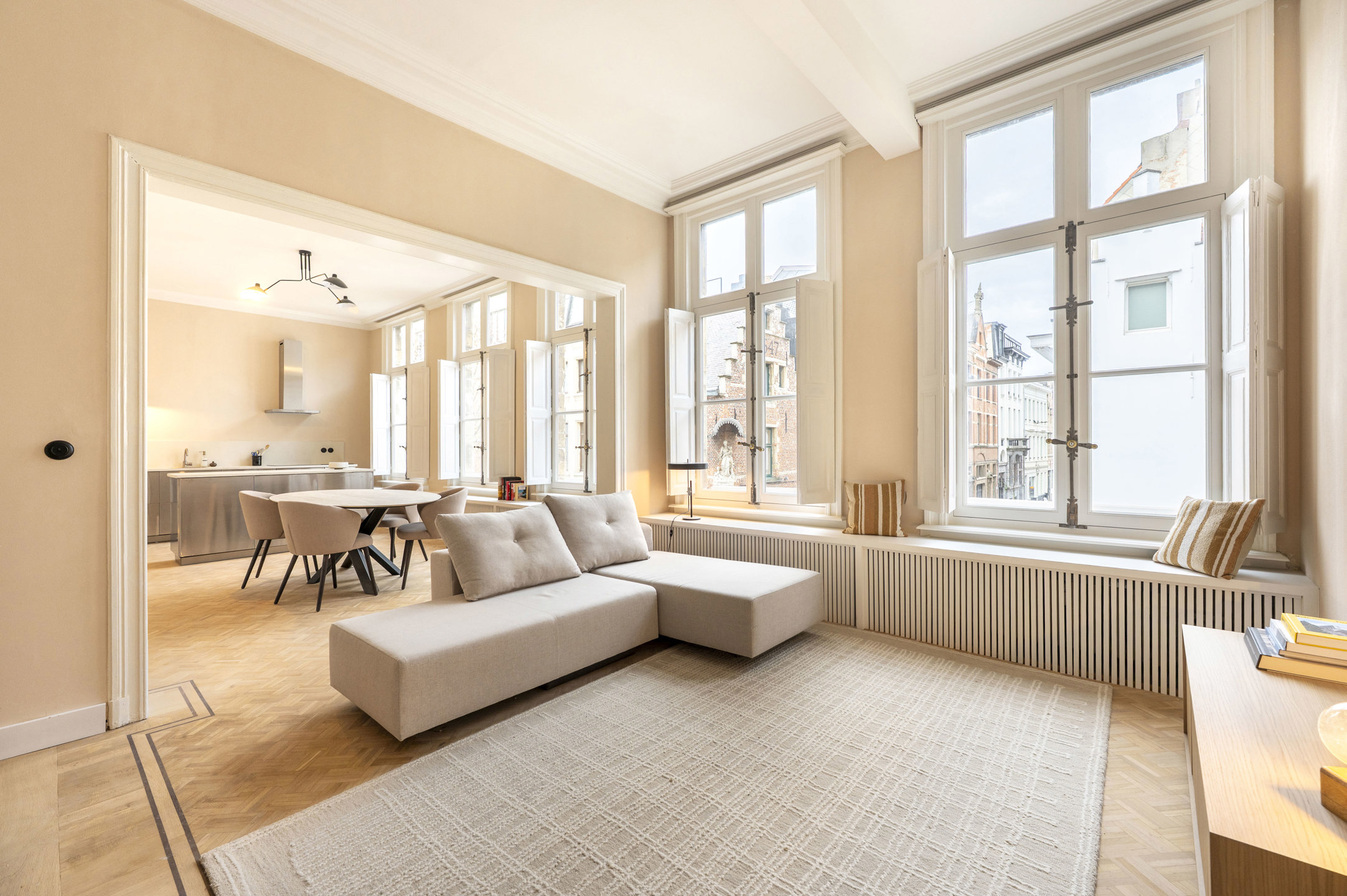 Dit unieke éénslaapkamerappartement van 80 m² bevindt zich in een uitzonderlijk 16e-eeuws stadspaleis, een ware aanrader voor wie houdt van karakter en historische charme. Het werd in 2025 volledig gerenoveerd, met behoud van de vele authentieke elementen die het pand zo bijzonder maken: prachtige parketvloeren, houten raamkozijnen, moulures en hoge plafonds zorgen voor een warme en elegante sfeer.