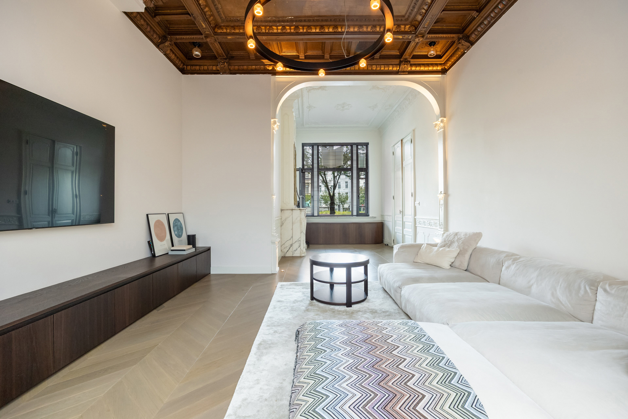 Dit gelijkvloers appartement bevindt zich in een herenhuis, opgedeeld in 4 units. Privé entree met marmer, twee prachtige ruimtes met hoge plafonds, originele plafonds en schouw. Vooraan mogelijks ontvangstruimte of bureau. Middenplaats momenteel ruim salon. Achteraan volwaardig geïnstalleerde keuken met eetplaats, aansluitend het terras. Verder op het gelijkvloers ruime master bedroom met badkamer. Op de eerste verdieping bevinden zich nog een grote en een kleine slaapkamer met badkamer. Wasplaats.
