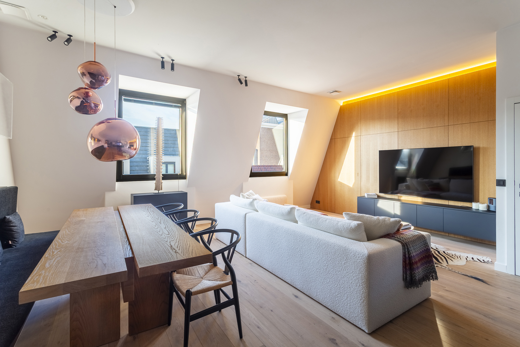 Bij het betreden van het appartement komt u terecht in de lichtrijke leefruimte met open keuken, dankzij de grote ramen die niet alleen zorgen voor een aangename lichtinval, maar ook een prachtig uitzicht over de stad bieden. Meteen valt de luxueuze afwerking op, met een prachtige parketvloer en een stijlvolle designkeuken, uitgerust met kwalitatieve inbouwtoestellen van Miele en overvloedige kastruimte.