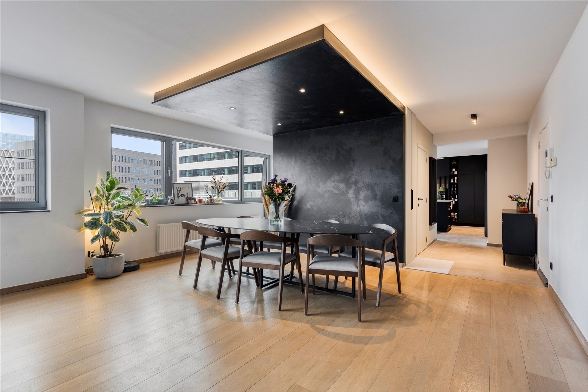 - Inkomhal: We betreden het appartement via de ruime centrale inkomhal, afgewerkt met een elegante Ciré betonvloer die naadloos doorloopt naar de keuken.