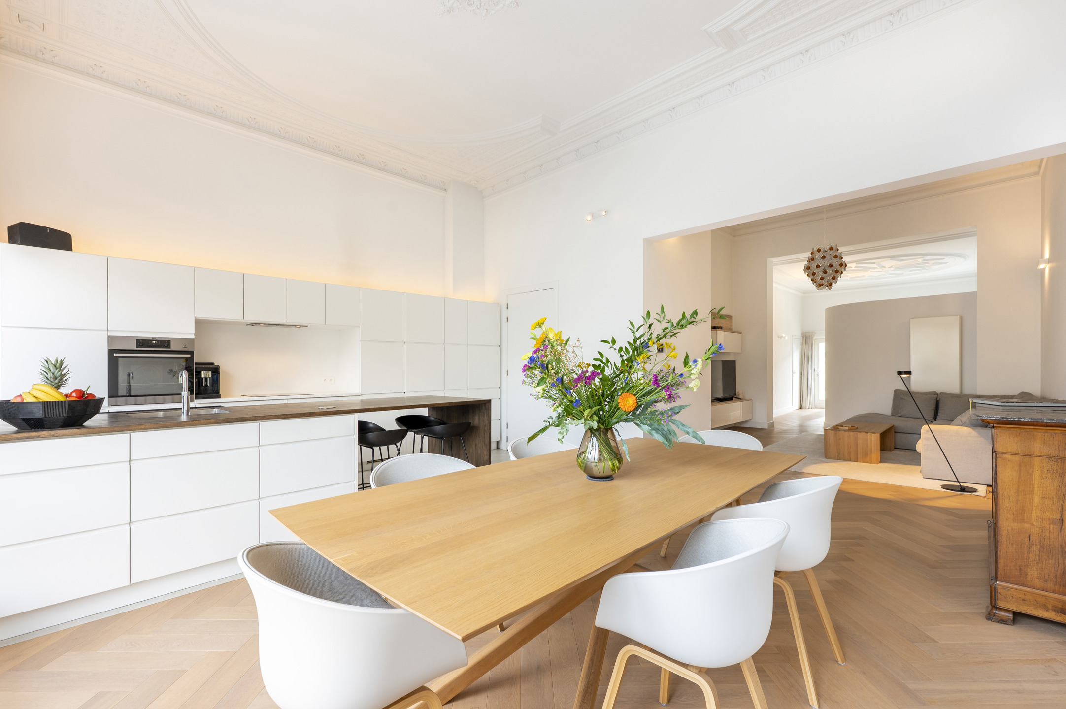 Indeling: Leefruimte met frontaal zicht op het groen van de Amerikalei en een verbluffende plafondhoogte. Eetkamer, woonkamer en de volledig geïnstalleerde keuken vloeien nadeloos over in elkaar, waardoor u altijd in connectie staat met uw gasten. Dankzij de mooie gevelbreedte vooraan en een doorzon met het raam achteraan, geniet u een overvloed aan licht. Via de leefruimte hebt u tevens toegang tot een uiterst zonnig zuidoost geörienteerd terras met zicht op de stadstuinen. Bovendien voelt u ook de authentieke charme dankzij de moulures aan het plafond. Separaat toilet.