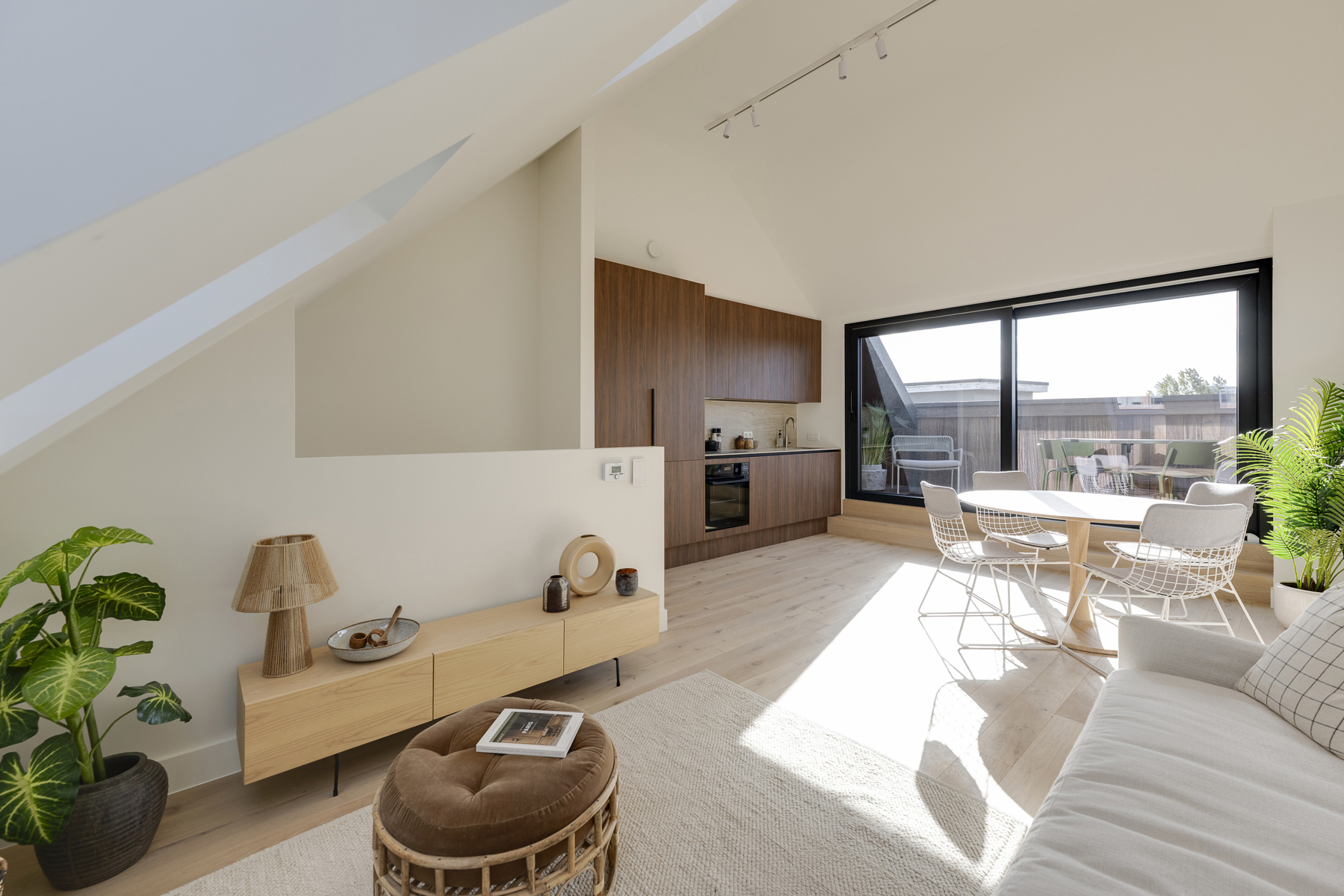 De leefruimte is bijzonder helder dankzij de grote raampartijen die uitgeven op een ruim, zuidgericht terras, perfect om buiten te ontspannen of te dineren. De moderne open keuken is uitgerust met hoogwaardige inbouwtoestellen en een stijlvol stenen werkblad.