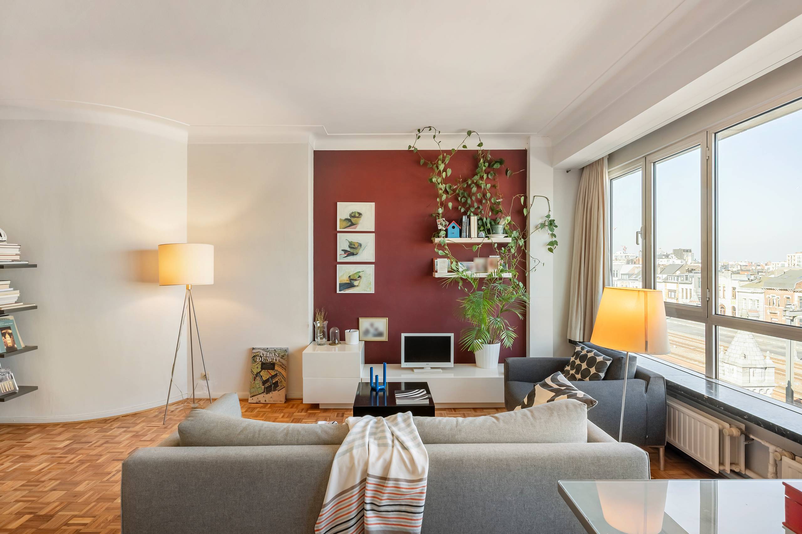 Links van de hal ligt de leefruimte op een knappe, net opgeschuurde blokjesparket. De kamer voelt warm en uitnodigend, inclusief een fijn zicht over Antwerpen dat elk moment van de dag een ander decor geeft. Een plek waar je vanzelf blijft hangen.