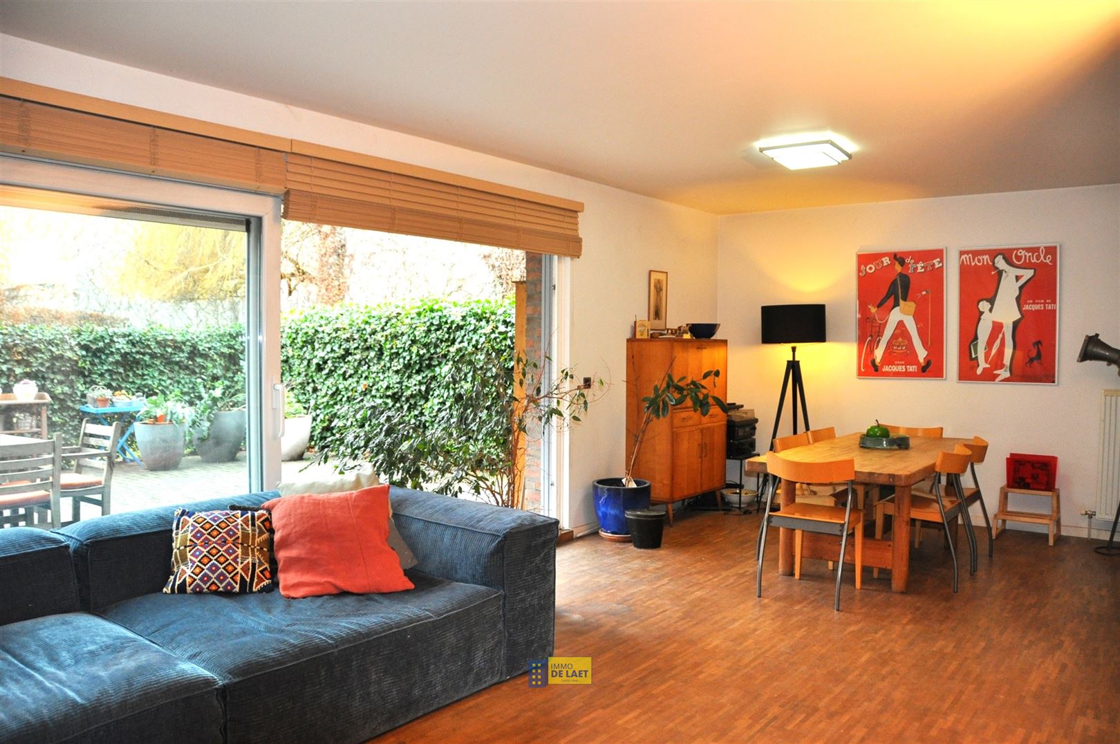 Het betreft een gelijkvloers appartement van 80m². Via de centrale inkomhal komen we in de leefruimte. Deze leefruimte met houten parketvloer is noord georiënteerd en via een schuifdeur staat deze in relatie tot een ruim betegeld terras van 50m². Er is toegang tot de gemeenschappelijke binnentuin en de straat. De keuken met toestellen is praktisch ingedeeld en is voorzien van toestellen. De grote en kleinere slaapkamers liggen vooraan het appartement. De betegelde badkamer heeft een ligbad en lavabomeubel, toilet is apart.