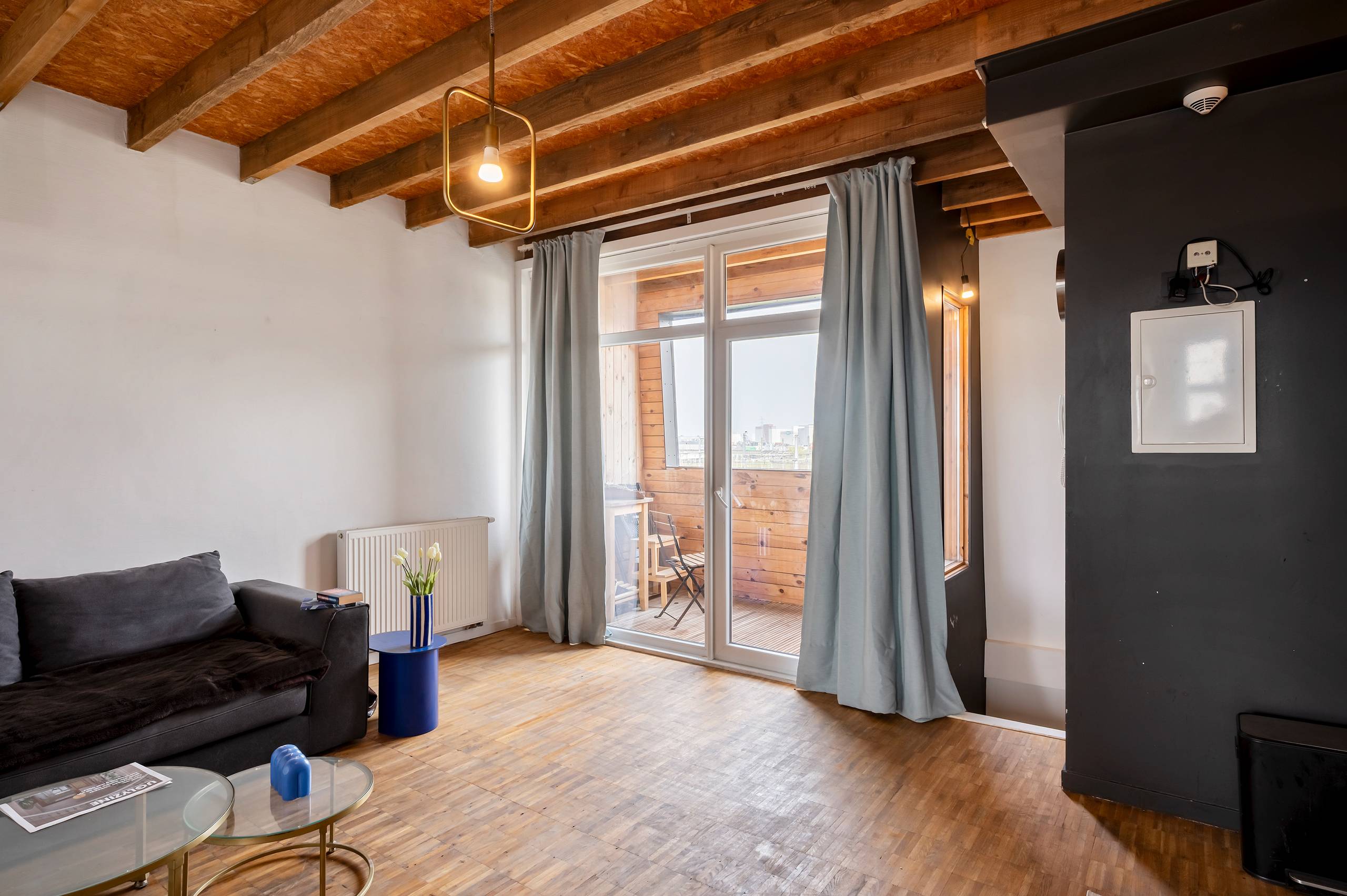Vanuit de leefruimte stap je zo het terras op. Inpandig, met hout bekleed en Oostgericht. De ochtenden beginnen hier zacht. Eerste koffie, eerste zon, nog wat stilte voor de stad echt op gang komt. Het is geen groot terras, maar wel eentje dat je elke dag gebruikt. Daar zijn we zeker van.