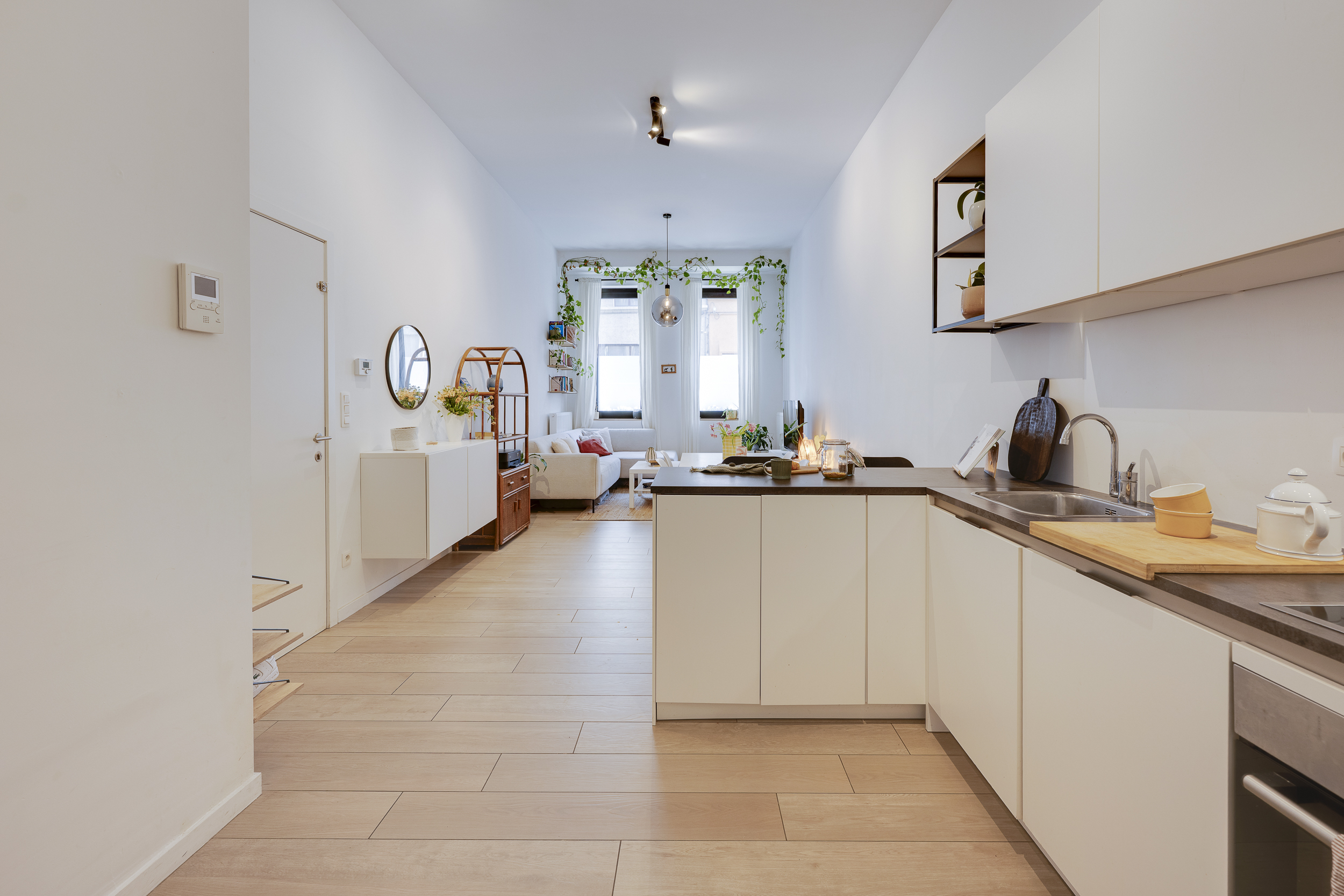Je stapt binnen in een ruimte die meteen goed zit. De leefruimte en keuken lopen mooi in elkaar over en creëren een open geheel waar licht vrij spel krijgt. Het warme vloerwerk onder je voeten maakt het meteen gezellig, terwijl de grote openheid zorgt voor ademruimte. Dit is zo’n plek waar je binnenkomt en zonder nadenken blijft hangen.