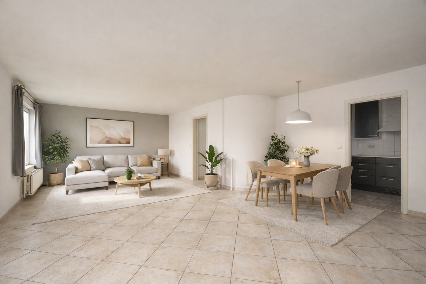 De ruime woonkamer (AI-beeld ter illustratie van de mogelijkheden) baadt in het licht en sluit mooi aan bij de keuken, die volledig uitgerust is met alle nodige toestellen.