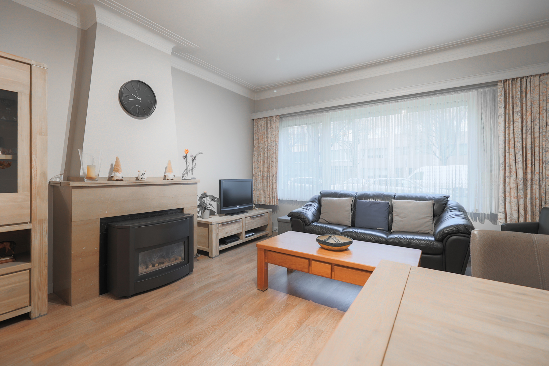 De leefruimte is aangenaam en helder, met voldoende plaats voor een zithoek en eettafel.