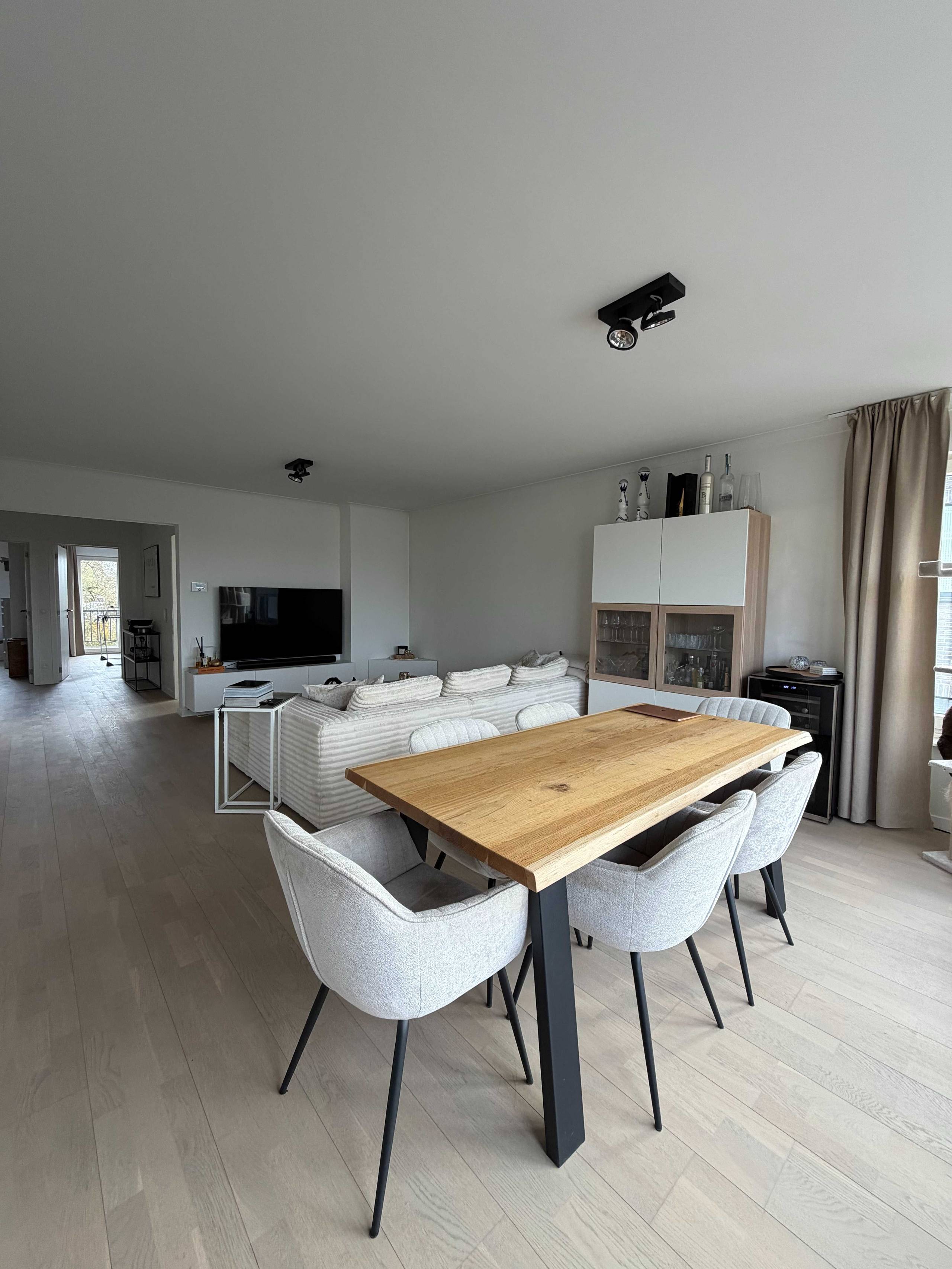 Bij het betreden van het appartement kom je in een ruime en royale inkomhal, die meteen een aangenaam gevoel van ruimte geeft. De grote leefruimte geniet van veel lichtinval met vliegenraam en sluit naadloos aan op de open keuken, wat zorgt voor een moderne en gezellige leefomgeving.