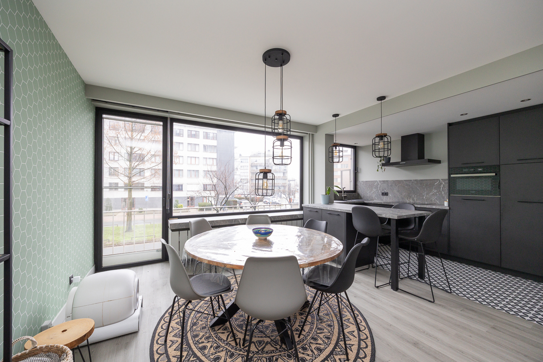 De moderne, vernieuwde keuken is praktisch ingericht en uitgerust met kwalitatieve toestellen: vaatwasser, koelkast, combi-oven, inductiekookplaat, dampkap en spoelbak. De vele opbergmogelijkheden zorgen voor optimaal gebruiksgemak.