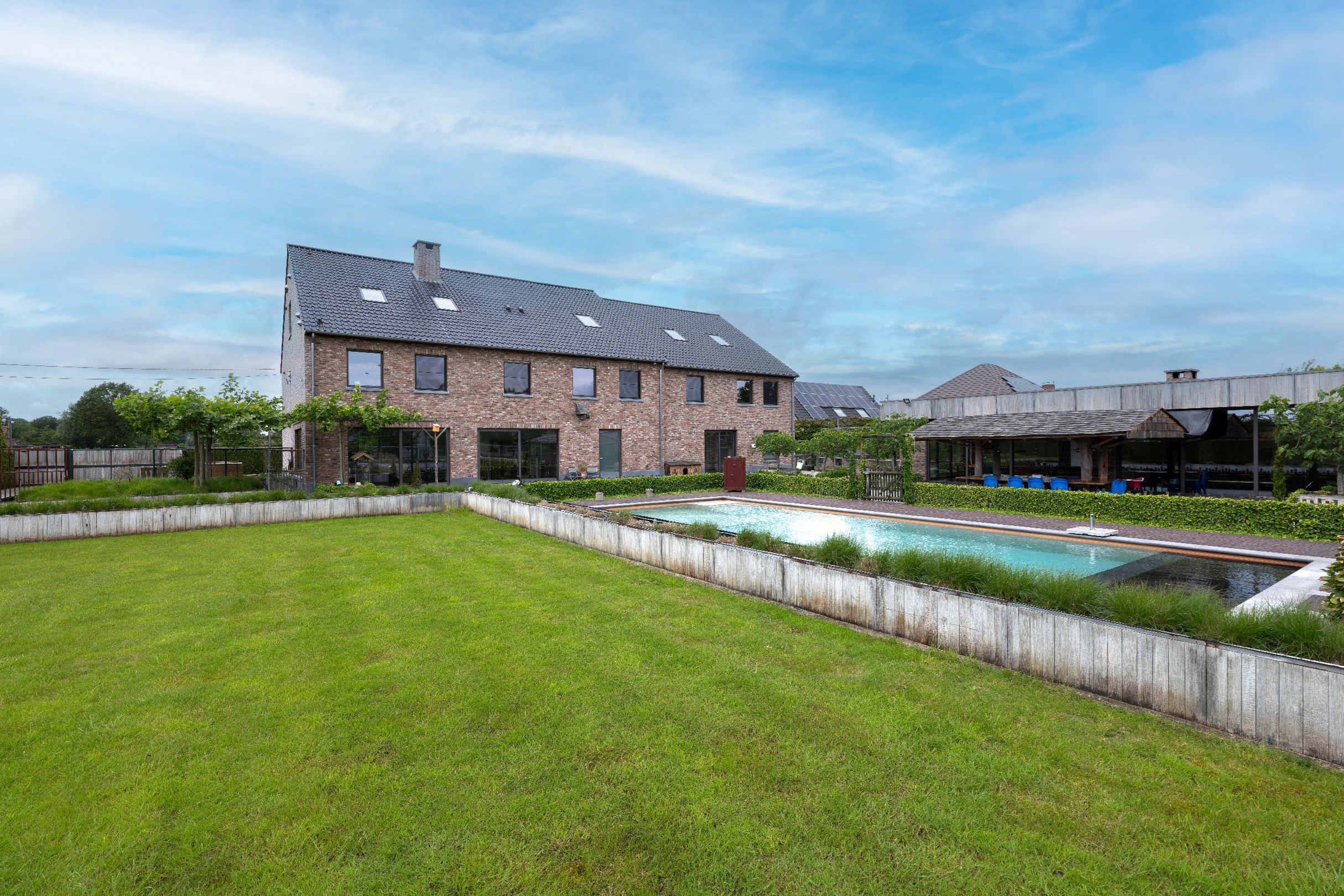 De zuidelijk gelegen tuin is een oase van ontspanning, compleet met een geautomatiseerd sproeisysteem, een verwarmd zwembad en een riant poolhouse van maar liefst 144m² (volledig onderkelderd). Voor dierenliefhebbers is er een schuur van 120m² met 5 paardenstallen en keurig omheinde weides achter de woning.