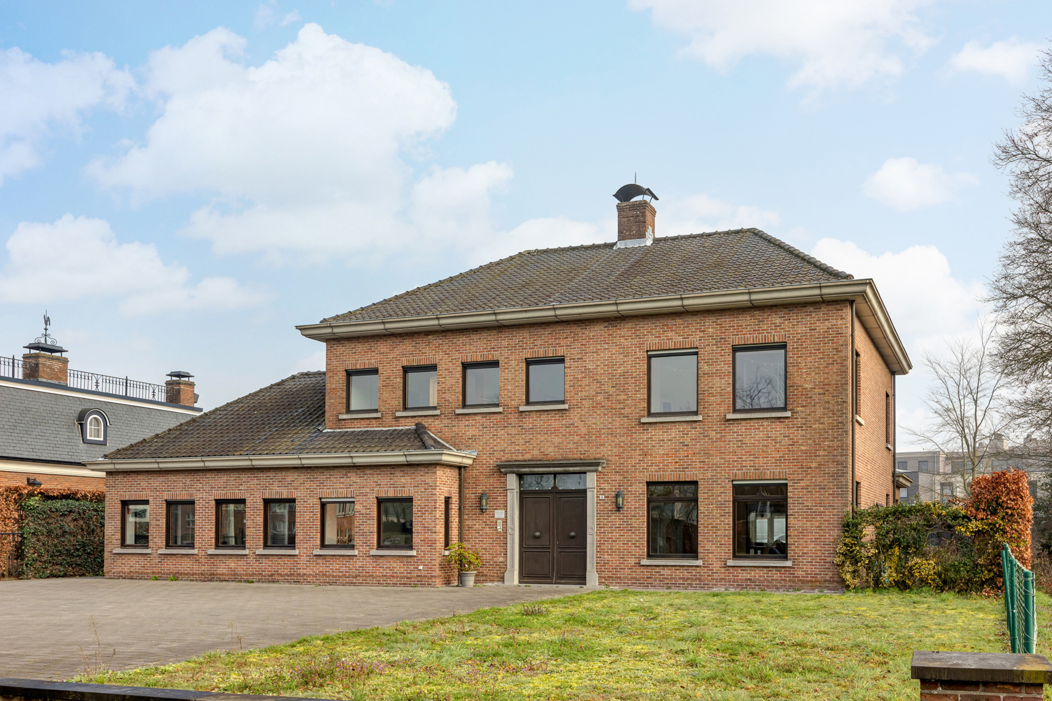 Aan de voorzijde biedt de woning een kantoor (50m²), met toegang langs een aparte zijdeur. Het kantoor beschikt over degelijke ingemaakte kasten en is reeds uitgerust met 2 grote bureau's.