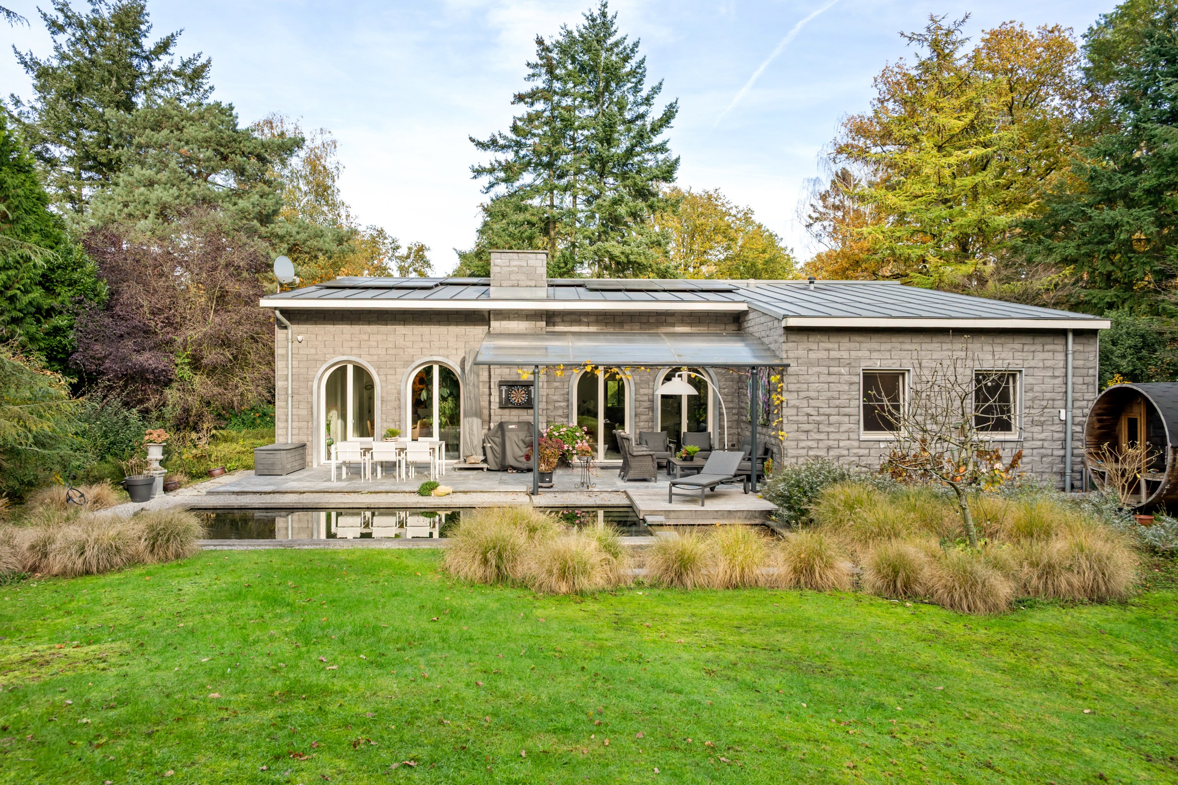 Ontdek deze instapklare, perfect onderhouden laagbouwwoning die comfort, luxe en energiezuinigheid combineert. De woning werd in 2006 volledig gerenoveerd en uitgebreid en kreeg afgelopen jaren enkele bijkomende vernieuwingen (verlichting, elektriciteit, parket in de slaapkamers, zwemvijver en Finse sauna). De woning bestaat voorts uit een zeer ruime woonkamer met gesloten keuken, bureau (of 3e slaapkamer), 2 slaapkamers, ensuite badkamer aan master bedroom, wasplaats, apart toilet met douche, dubbele garage en carport.