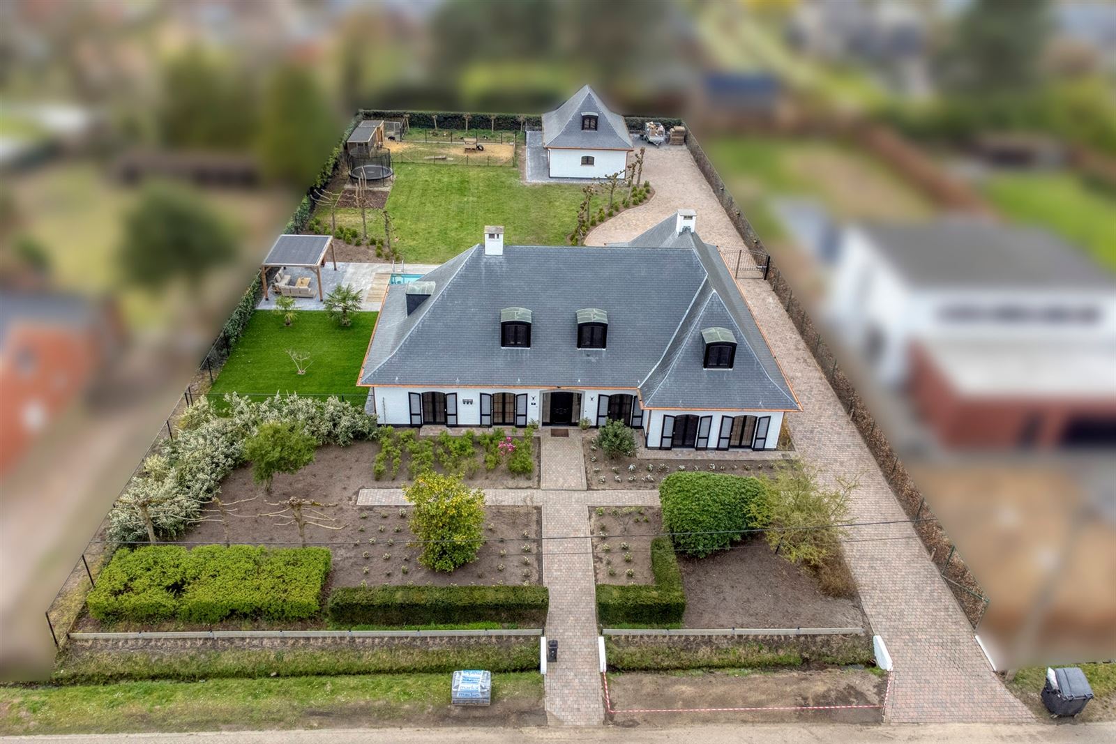 Bent u op zoek naar een RUIME en ruim ingedeelde instapklare luxe villa met ook nog eens veel buitenruimte en een grote garage? En zelfs nog een zwembad en de mogelijkheid tot kangoeroewoonst? Hier is het allemaal. Deze woning heeft een bewoonbare oppervlakte van ca 350 m2 en is gelegen op een mooi breed zuidgericht perceel van 2451 m². De ligging is TOP: rustig, residentieel en vlakbij natuurgebieden. Het bijgebouw / de grote garage biedt plaats voor 3 auto's en op het terrein is plaats zat voor uw mobilhome, camionette(s).... Deze luxe villa is zeer degelijk afgewerkt. De eerste eigenaar was dan ook schrijnwerker en dat merk je door heel de woning: degelijke houten vloeren, trap, enorm veel inbouwkasten, ramen, deuren, keuken: alles topkwaliteit. De woning is perfect gelijklvloers te bewonen doordat er verschillende slaapkamers en een badkamer zijn. Ook lenen de kamers zich perfect om jouw zelfstandig beroep / bijberoep uit te oefenen: kapsalon, schoonheidssalon, kantoor, .....Er is een aparte zij-ingang: ideaal om uw klanten te ontvangen of als tweede, aparte toegang tot de bovenverdieping.De verdieping is een enorme extra: hier zijn zoveel mogelijkheden: er zijn 3 slaapkamers en een grote polyvalente ruimte met keukenblok en badkamer: dan denk je direct aan co-housen, kangoeroewonen, ruimte voor logées, hobbyruimte, etcMogelijkheden genoeg! Bekijk ook zeker de plannen met volledige indeling en de video op onze site! Maak snel jouw afspraak voor dit unieke pand!