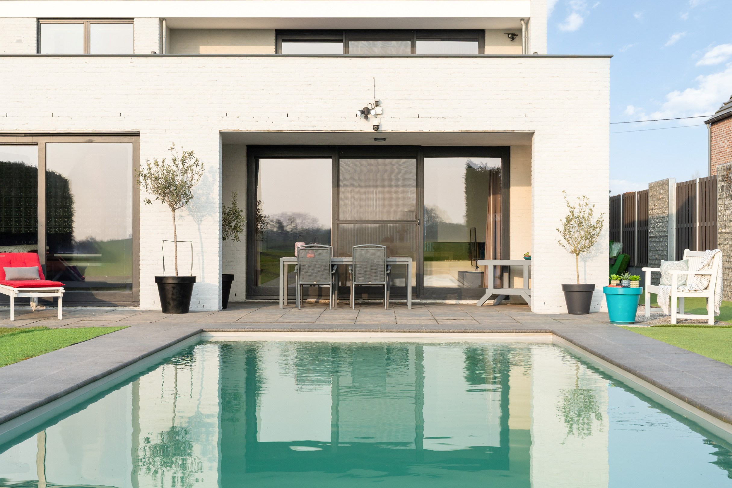 De zuid gerichte tuin biedt een hoge mate van privacy en vormt een ideale omgeving voor wie graag van het buitenleven geniet. Het verwarmde buitenzwembad, uitgerust met een afdekrolluik en zonnecollectoren, biedt een prachtig uitzicht op de achterliggende grasvelden en creëert een bijzonder rustige en aangename sfeer.