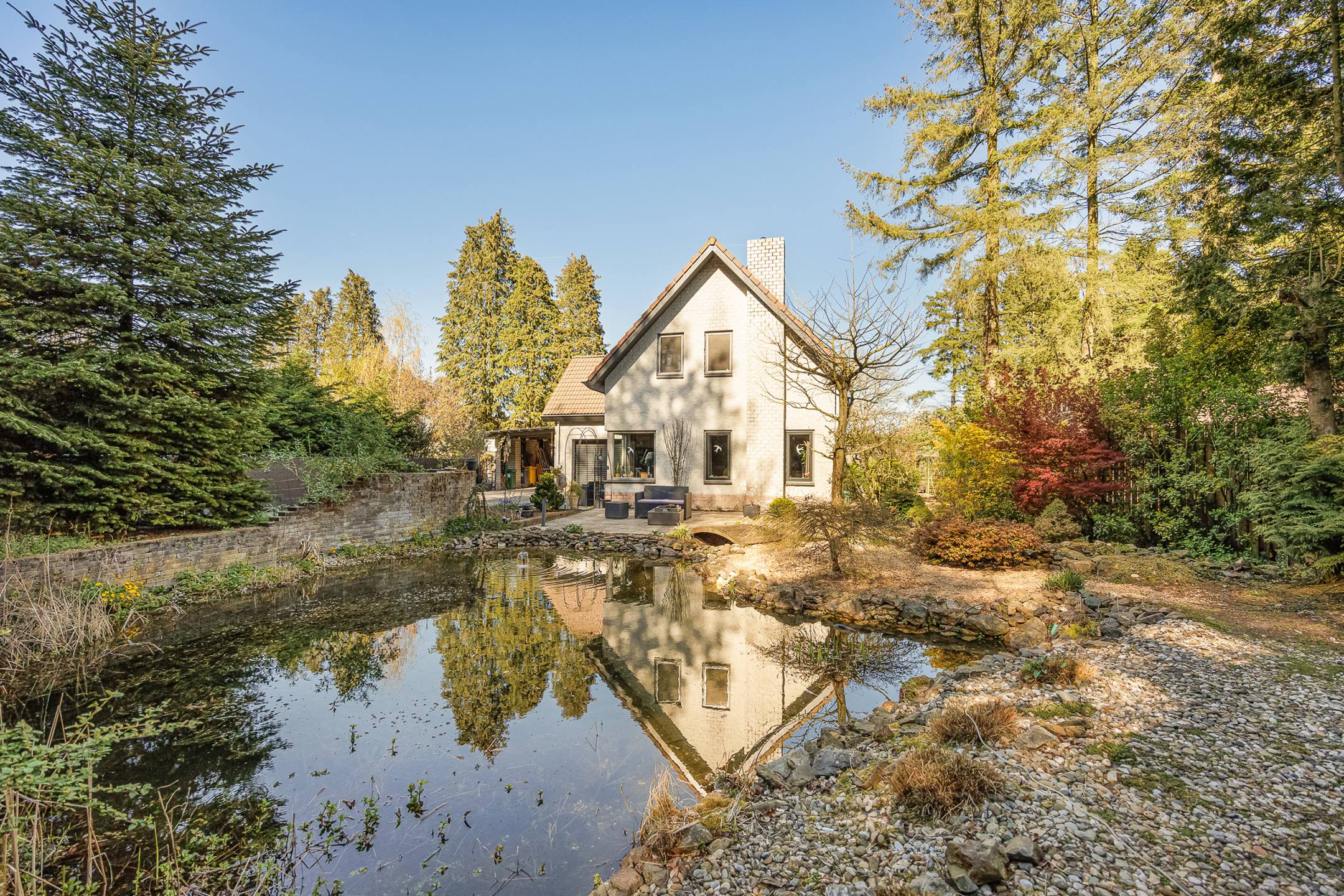Ook buiten is het volop genieten. De prachtig aangelegde tuin met ruim terras en prachtige vijverpartij, biedt de ideale plek om te ontspannen of gezellig te tafelen in de natuur. Naast de woning is een carport voorzien die via de ruime oprit bereikbaar is. Op het volledig omheinde perceel staat bovendien een praktisch tuinhuis.
