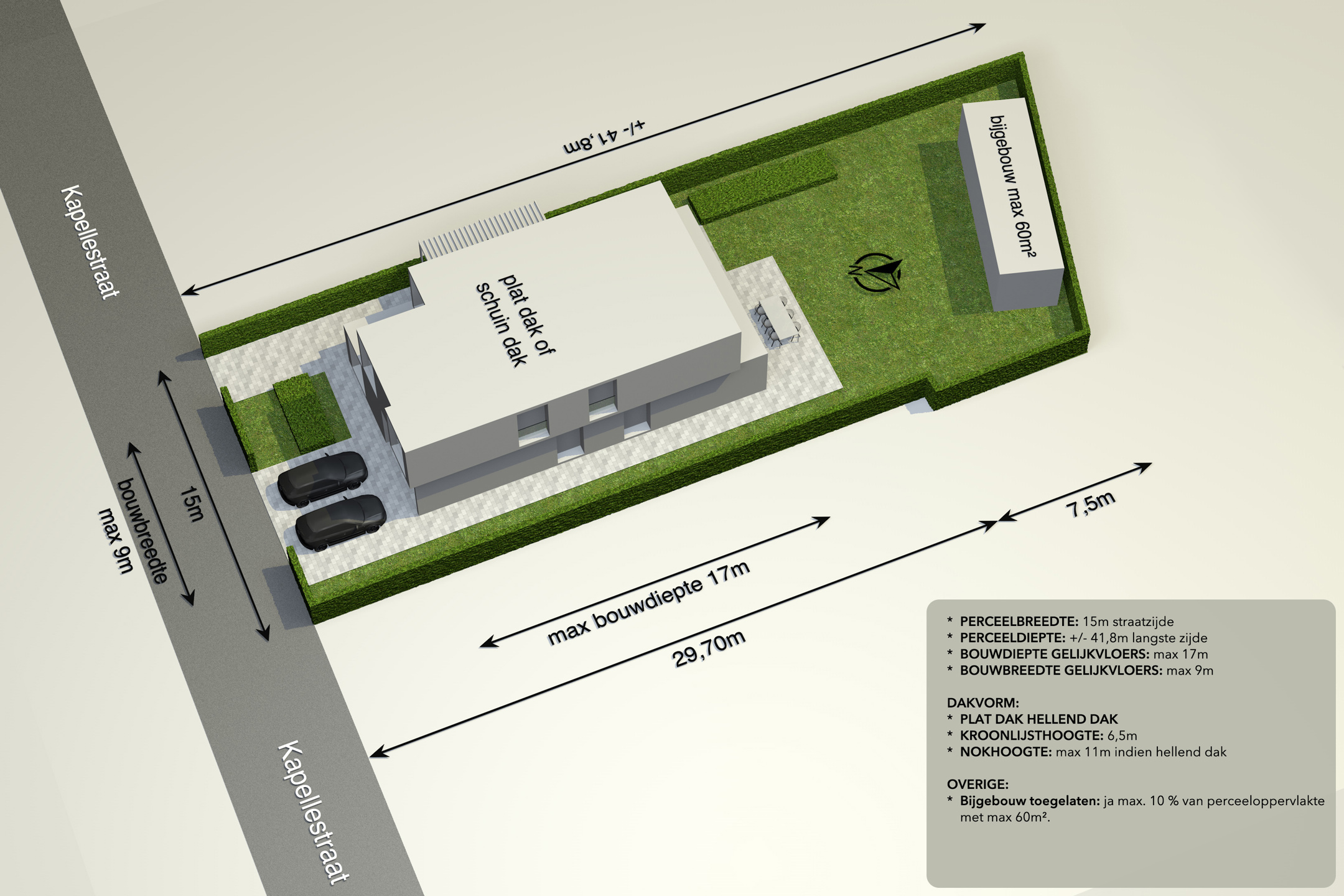 De grond is geschikt voor een open bebouwing met een garage aan de linkerzijde van de woning.