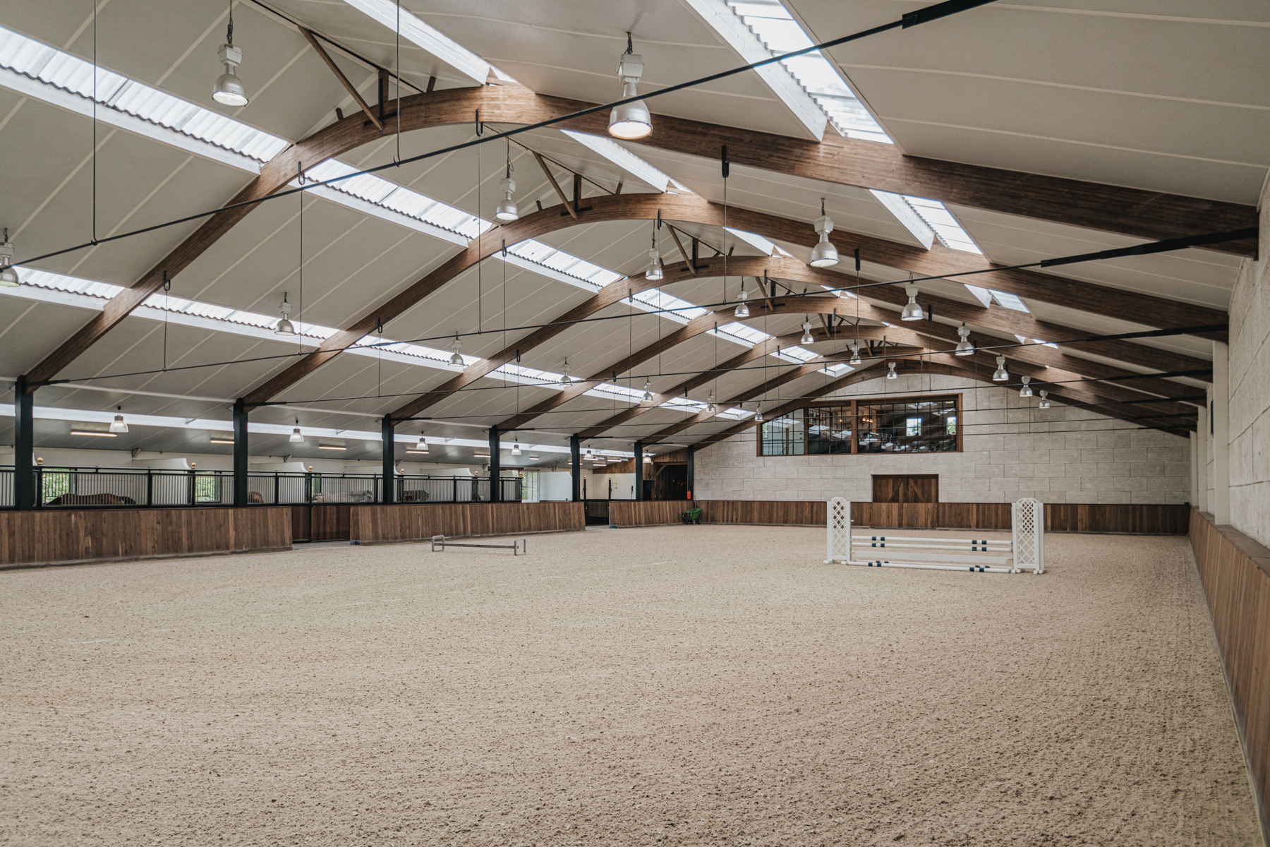 Het gangpad tussen de stallen en piste is voorzien van subtiele nachtverlichting, evenals buiten aan het gebouw.
