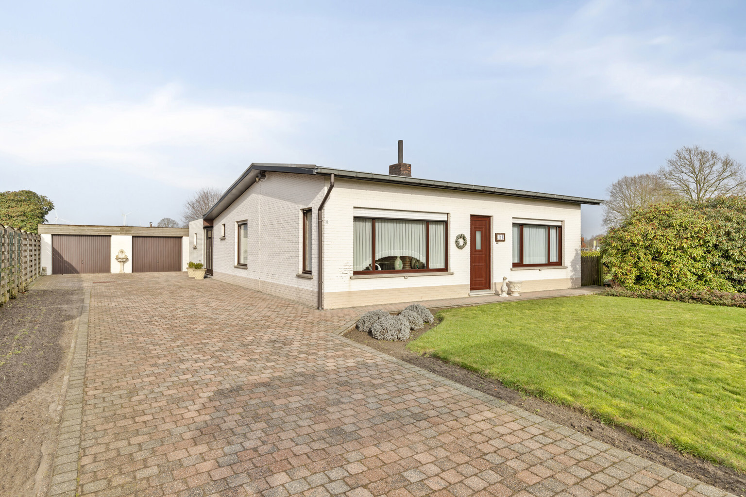 Op het perceel bevindt zich een grote dubbele garage met twee afzonderlijke poorten, ideaal voor wagens, opslag of wie extra werkruimte wenst. De tuin is mooi aangelegd en biedt de nodige privacy en ruimte om te genieten van het landelijke zicht.