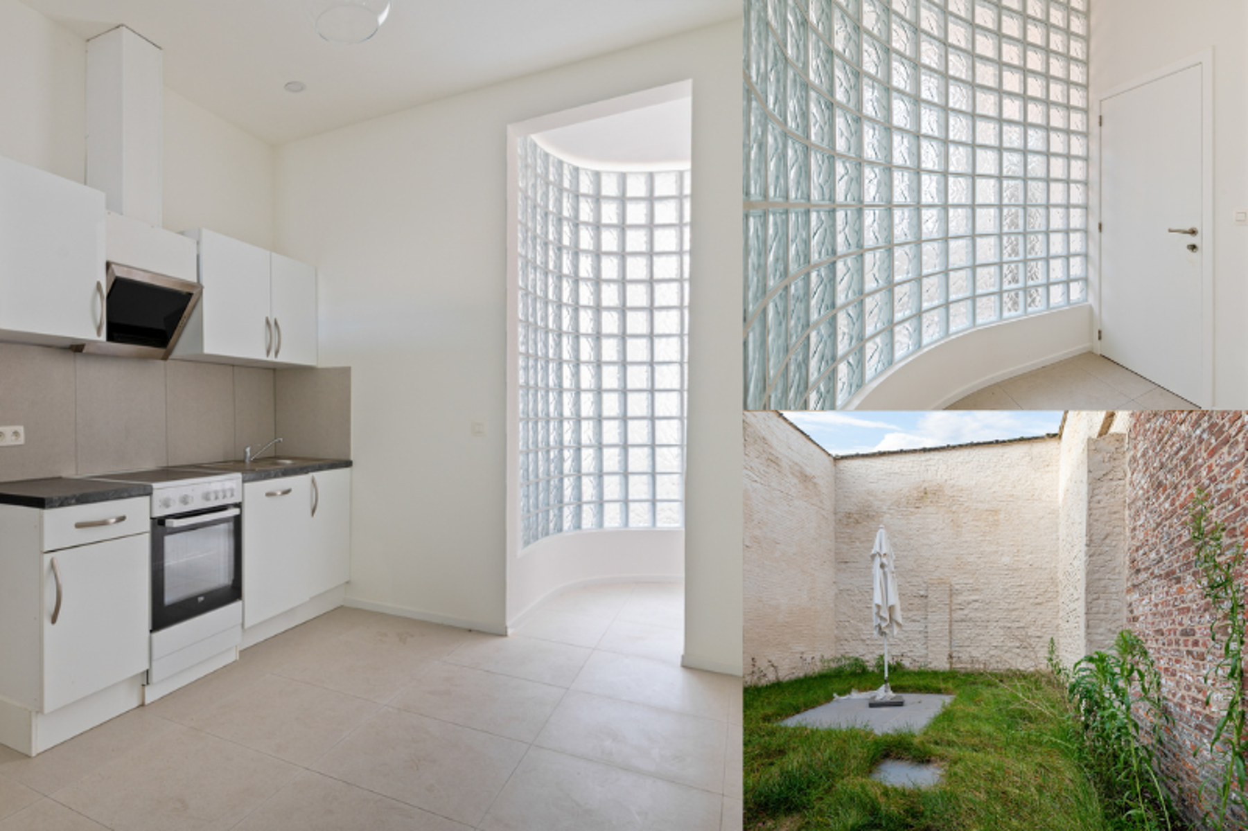 Waar de gevel klasse en allure uitstraalt door de smeedijzeren raamleuningen, kroonlijsten en subtiele gevelornamenten, heerst er in het appartement zelf juist een frisse, hedendaagse toets. Bij binnenkomst word je namelijk meteen verrast door een glasdallenwand die zorgt voor een overvloed aan natuurlijk daglicht, met behoudt van privacy. Aangrenzend bevindt zich de leefruimte met open keuken die praktisch werd geïnstalleerd voor het dagelijks gebruik. Verder heb je hier nog een slaapkamer (8 m²) met aansluitend een praktische dressing en uiteraard een badkamer met inloopdouche, deze werd in een stijlvol marmeren jasje gestoken.