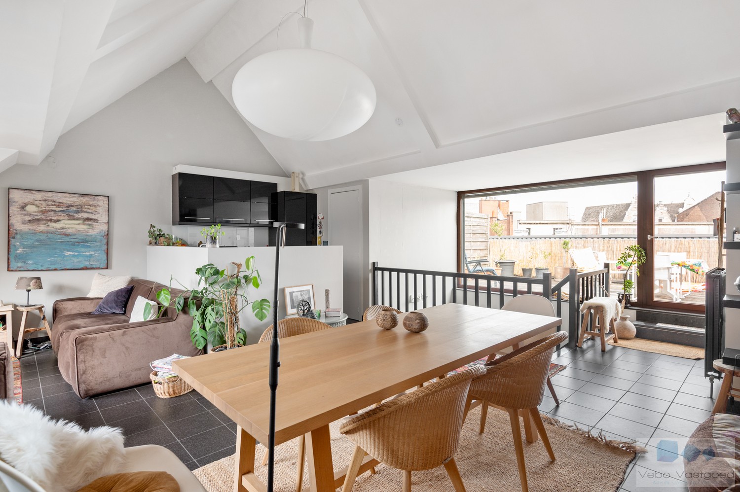 We komen het appartement binnen langs de inkomhal, voorzien van vestiaire en met toegang naar 2 ruime slaapkamers alsook geïnstalleerde badkamer. Via de vaste trap bereiken we de bovenverdieping. Hier treffen we de ruime en zeer lichtrijke leefruimte met zithoek, eetplaats en hoge plafonds dewelke zorgen voor een ruimtelijk en aangenaam gevoel. De geïnstalleerde, open keuken geniet alle hedendaags comfort en aparte berging met voorziening wasmachine.