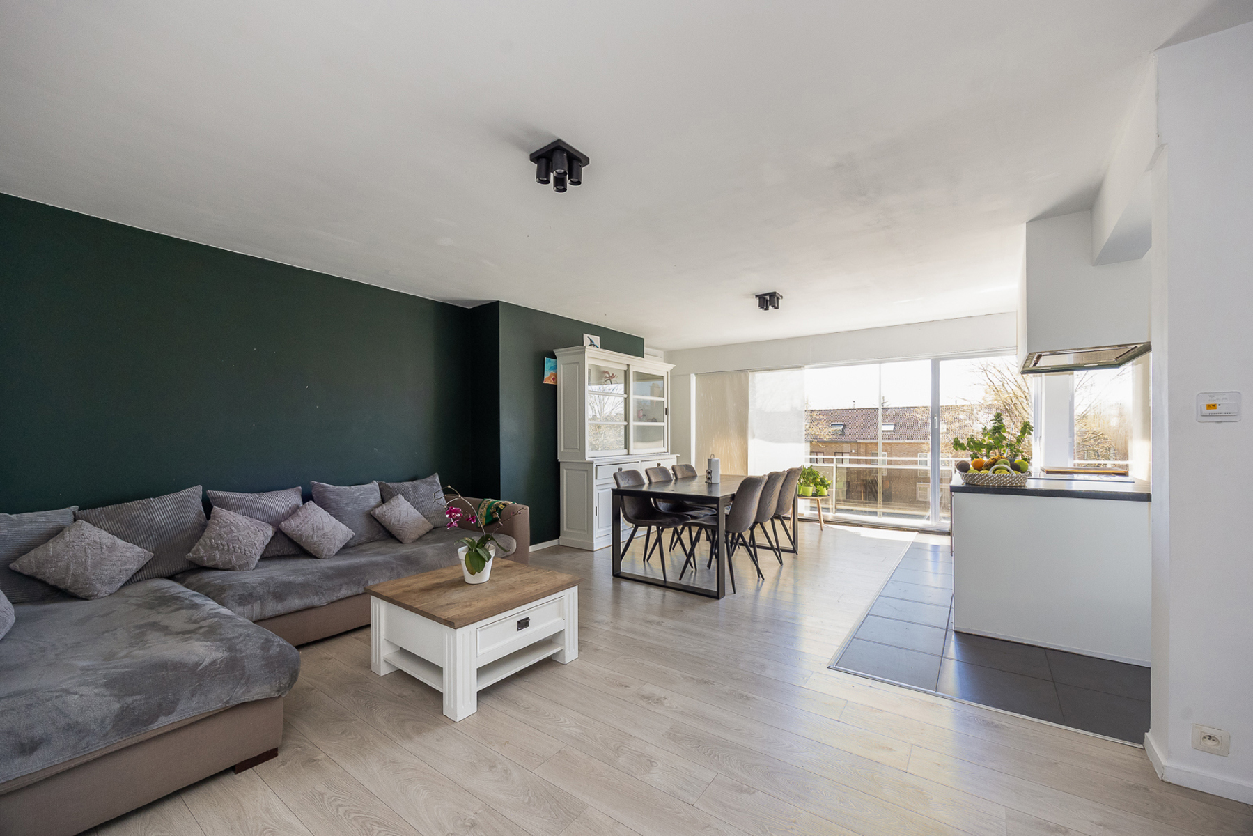 De gezellige, lichtrijke woonkamer met moderne open keuken vormt het hart van de woning en biedt directe toegang tot het eerste zonnige terras.