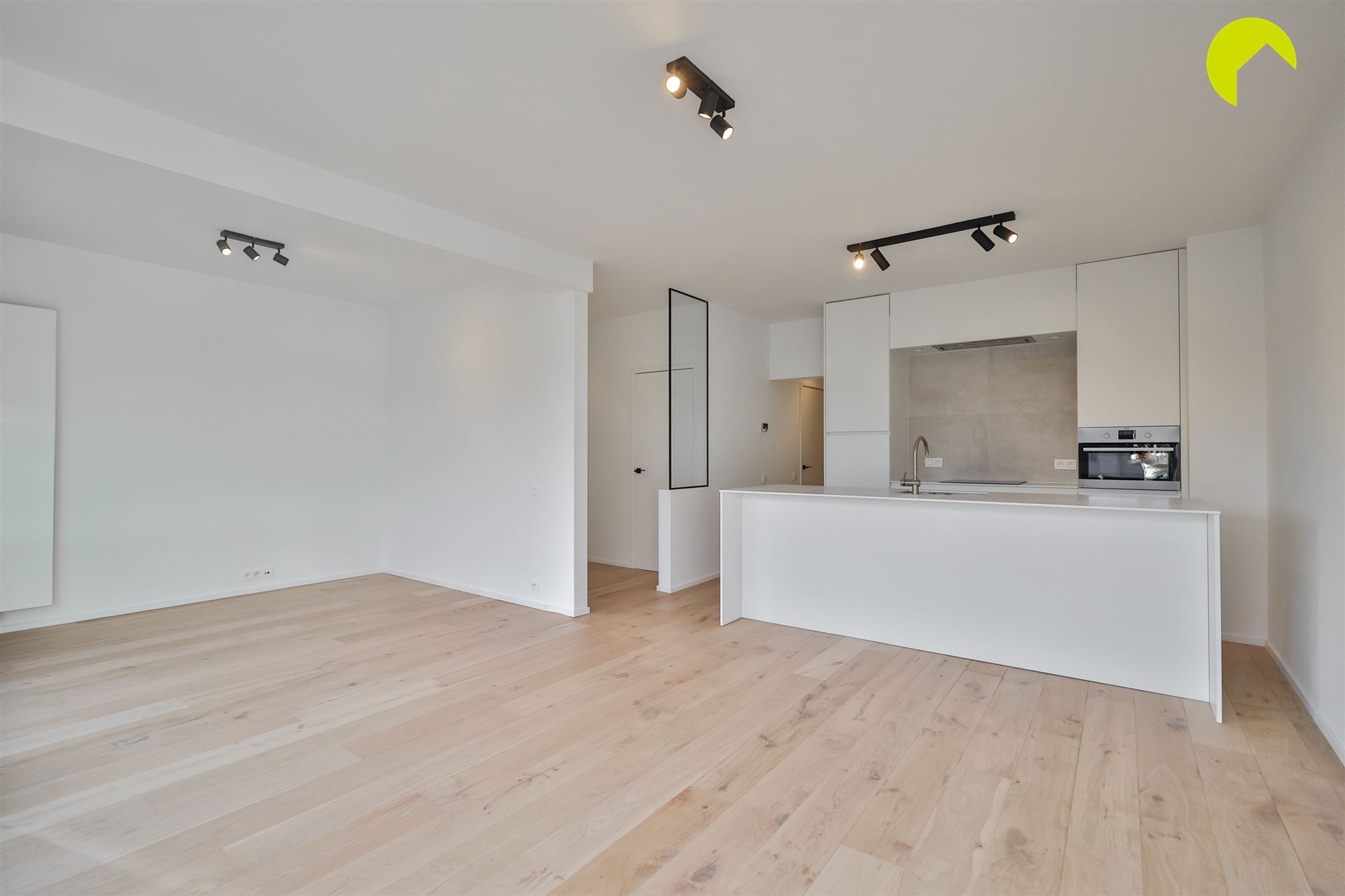 We lopen verder door en bereiken de zeer lichte leefruimte. De combinatie van kwaliltatieve parket en tegels geven het appartement een moderne look.