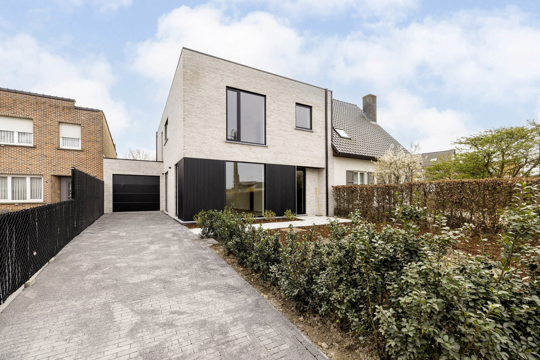 De voortuin is aangelegd en omheind met oprit naar de garage; achteraan mooi terras en volledig privatieve tuin met zicht op groen.
