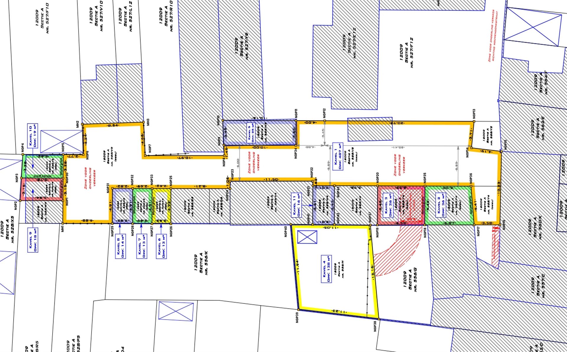 - Kavel 2: dubbele garage met bovenliggende zolder. Toegang tot de zolder bevindt zich momenteel in de middelste garage. Grondopp. ca. 36 m².