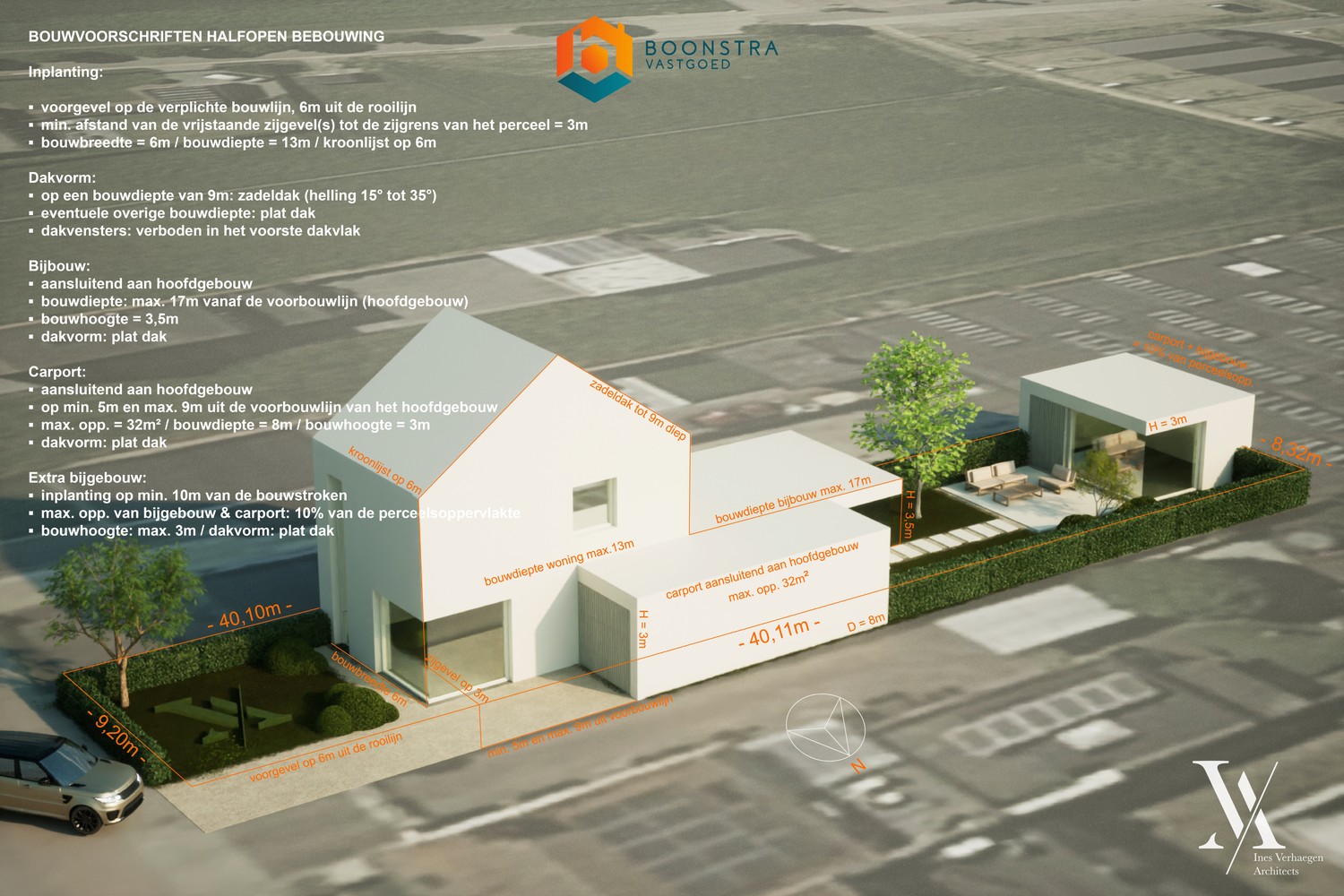 - Bebouwing: gekoppeld zoals aangeduid op het plan (halfopen bebouwing)
