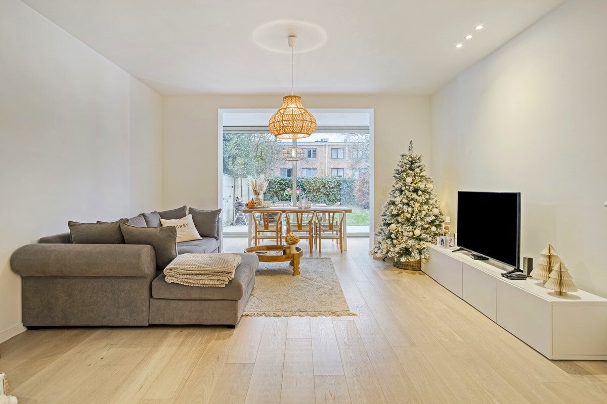 We betreden het appartement via de inkomhal met plek voor vestiaire. De open keuken beschikt over de nodige ingebouwde toestellen: oven, vaatwas, koelkast en vriezer, inductiekookplaat en dampkap. De leefruimte op parket is dankzij de grote raampartijen zeer lichtrijk en heeft een prachtig uitzicht over de tuin.