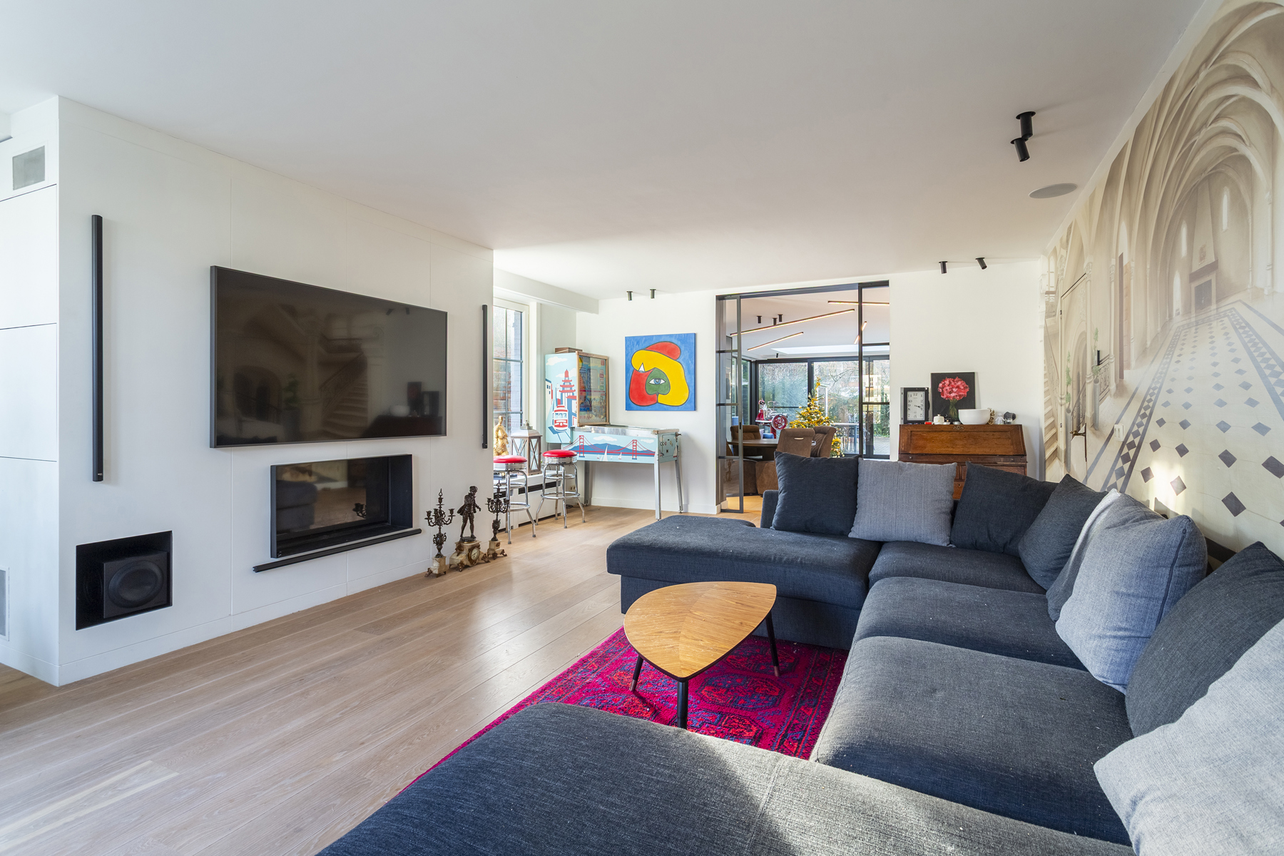 U betreedt de woning via een ruime INKOMHAL van ca. 19m², voorzien van schoen- en kledingkast met een apart toilet en handenwasser. Vervolgens komt u in de ruime LIVING van ca. 40m² op parketvloer. Via een glazen schuifdeur komt u komt u in de hypermoderne LEEFKEUKEN van ca. 65m² is maatwerk en uitgerust met een ontbijthoek, tal van opbergkasten en Miele toestellen: Keramieken werkblad, 2 ijskasten en vriezers met wijnkoeler, oven, ingebouwd koffiemachine, stoomoven, vaatwasser, combi-oven, microgolf, bordverwarmer, vacumeerlade, inductie kookplaat met dampkap en een ingebouwde spoelbak. Living en keuken zijn beiden tevens uitgerust met domotica en beschikken over een open haard.